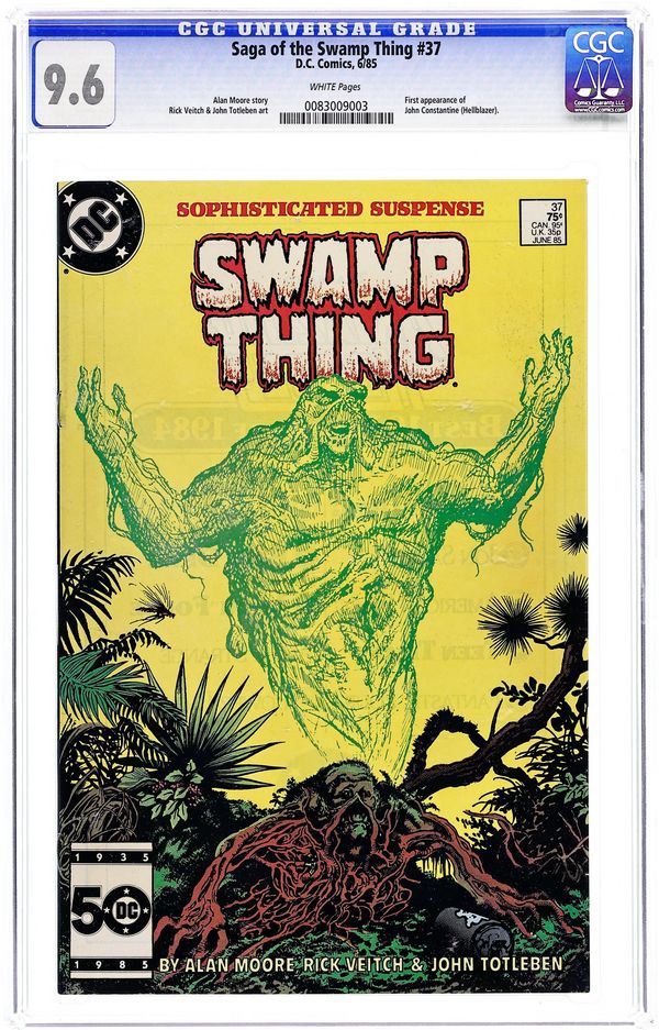 "Growth Patterns!" Written by Alan Moore, with art by Rick Veitch and John Totleben. Cover by Stephen Bissette and Totleben. New "Growth Patterns" and other strange abilities emerge in Swamp Thing as he fights for survival. NOTE: 1st appearance of John Constantine, Hellblazer. 36 pages, full color. Cover price $0.75.