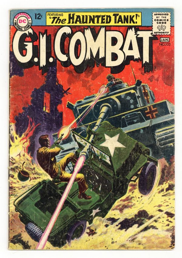 Cover by Russ Heath and Jack Adler (washtone). Written by Robert Kanigher. Art by Russ Heath and Irv Novick. The Haunted Tank crew must figure out how the Nazis are able to destroy their tanks in numerical order in "The Haunted Tank vs. Killer Tank!" by Robert Kanigher and Russ Heath. Starring the Haunted Tank, Jeb Stuart, Arch Asher, Rick Rawlins, Slim Stryker, General J.E.B. Stuart (ghost), Herb Green, Mac Adams and Hickie. Plus: "No-Gun Crew!" by Kanigher and Irv Novick. And: 1-pager "I'll Try, Sir!" 36 Pages, Full Color. Cover price $0.12.