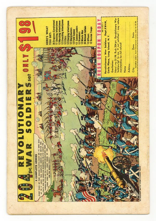 Cover by Dick Dillin and Chuck Cuidera. Written by unknown. Art by Dick Dillin, George Klein and unknown. War front fury! Battlefield adventures! In this issue: "The Fires of War," with pencils by Dick Dillin; "The Mystery of No Man's Land"; "Grudge Patrol," reprinted from issue #10; 1-page text story "Lucky Mistake"; and "The A-Gun Hijackers," with inks by George Klein. 36 Pages, Full Color. Cover price $0.10.