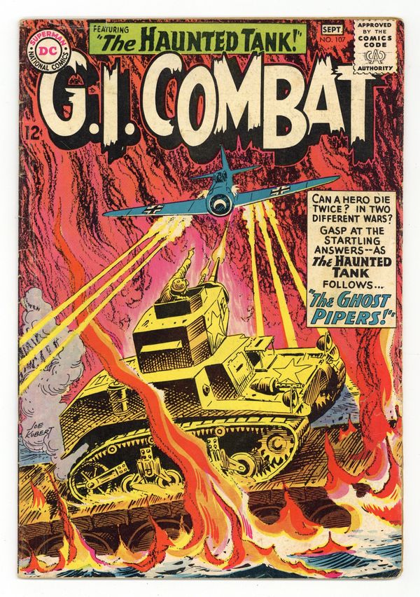 Cover by Joe Kubert. Written by Robert Kanigher and Kin Platt. Art by Joe Kubert, Ross Andru and Mike Esposito. A ghostly piper leads the Haunted Tank to WWI to help his buddies stop a tank attack, then another ghostly piper leads the Haunted Tank back to WWII to help another Scottish regiment against three Tiger tanks in "The Ghost Pipers!" by Robert Kanigher and Joe Kubert. Starring the Haunted Tank, Jeb Stuart, Arch Asher, Rick Rawlins, Slim Stryker and General J.E.B. Stuart (ghost). Plus: "Dogtag Guard!" by Kin Platt, Ross Andru and Mike Esposito. 36 Pages, Full Color. Cover price $0.12.