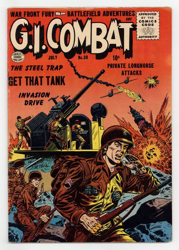 July 1956: Cover by Dick Dillin and Charles Cuidera; "The Steel Trap," 9 pages; "Get That Tank," 6 pages (reprinted from G.I. Combat #9); "Invasion Drive," 7 pages; "Incident in a Storm," 1 page text story; "Private Longhorse Attacks," 6 pages (reprinted from G.I. Combat #8"). 36 Pages, Full Color. Cover price $0.10.
