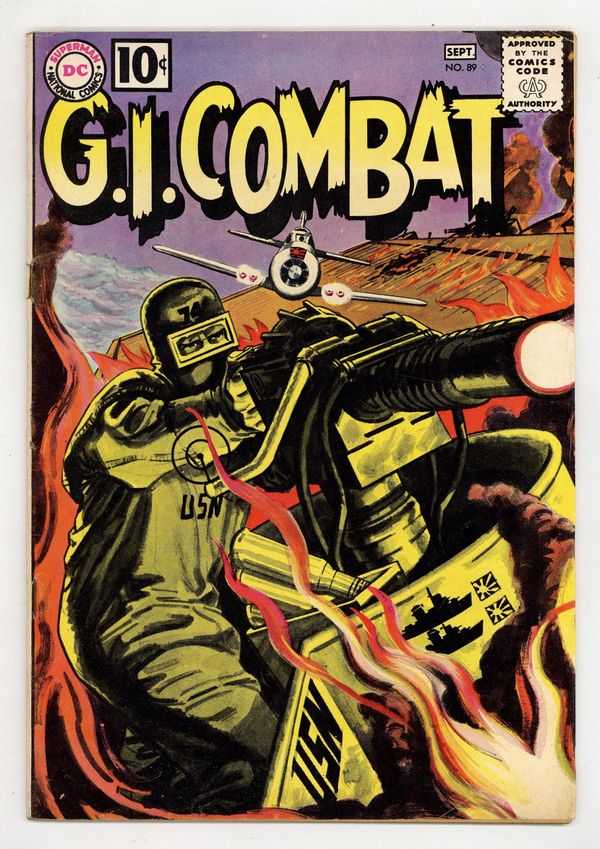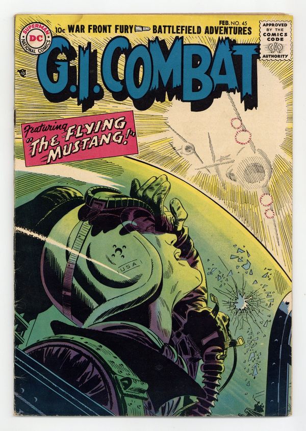 Cover by Jerry Grandenetti. Written by Robert Kanigher and Bob Haney. Art by Joe Kubert, Russ Heath, Arthur Peddy, Ross Andru and Mike Esposito. War front fury! Battlefield adventures! In this issue: "Fireworks Hill!" by Robert Kanigher and Joe Kubert; "Frogman vs Sub!" by Bob Haney and Russ Heath; "The TNT Tank!" by Haney and Arthur Peddy; "The Flying Mustang" by Haney, Ross Andru and Mike Esposito; and 1-page article "Flying Rescue Ship." 36 Pages, Full Color. Cover price $0.10.