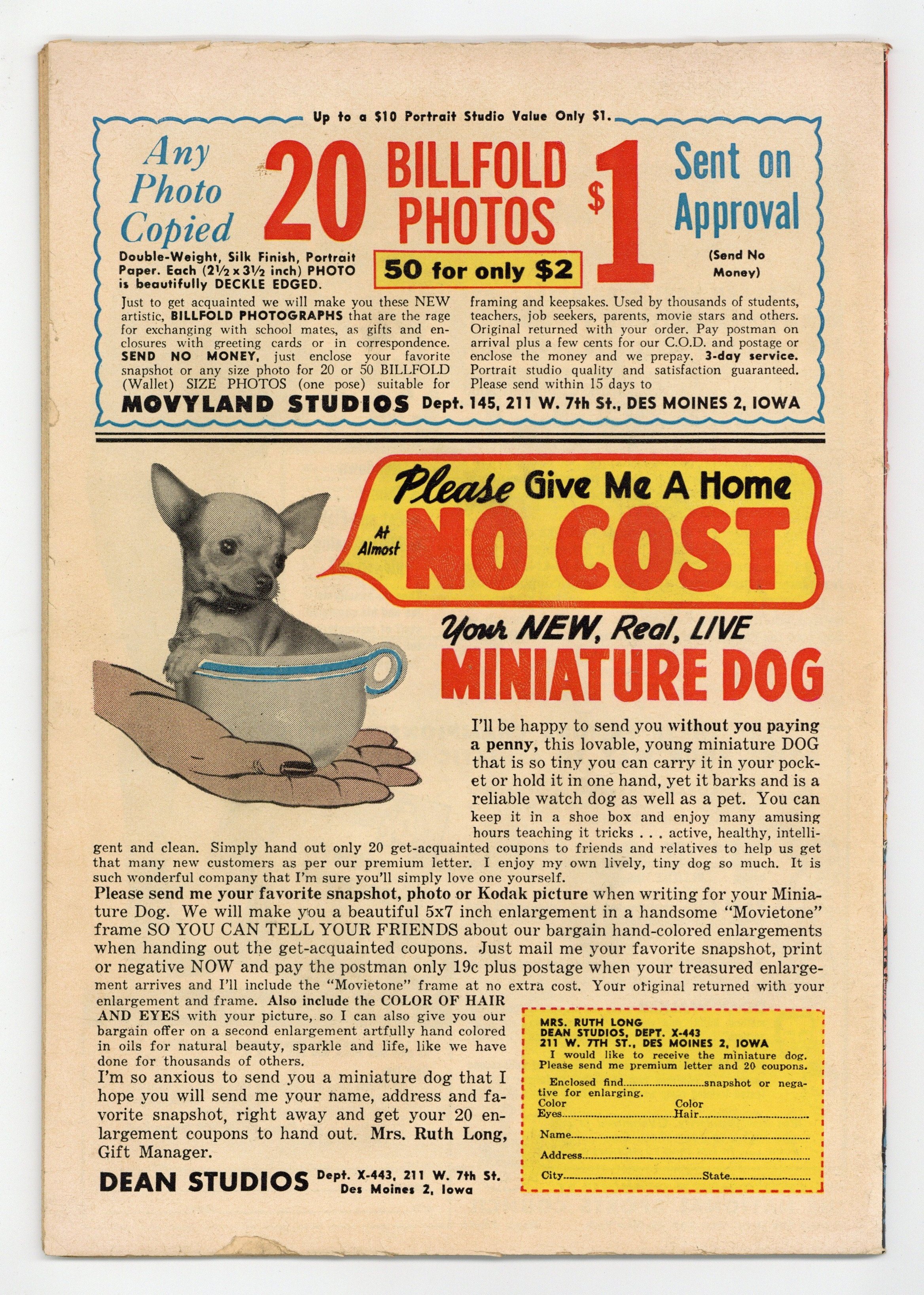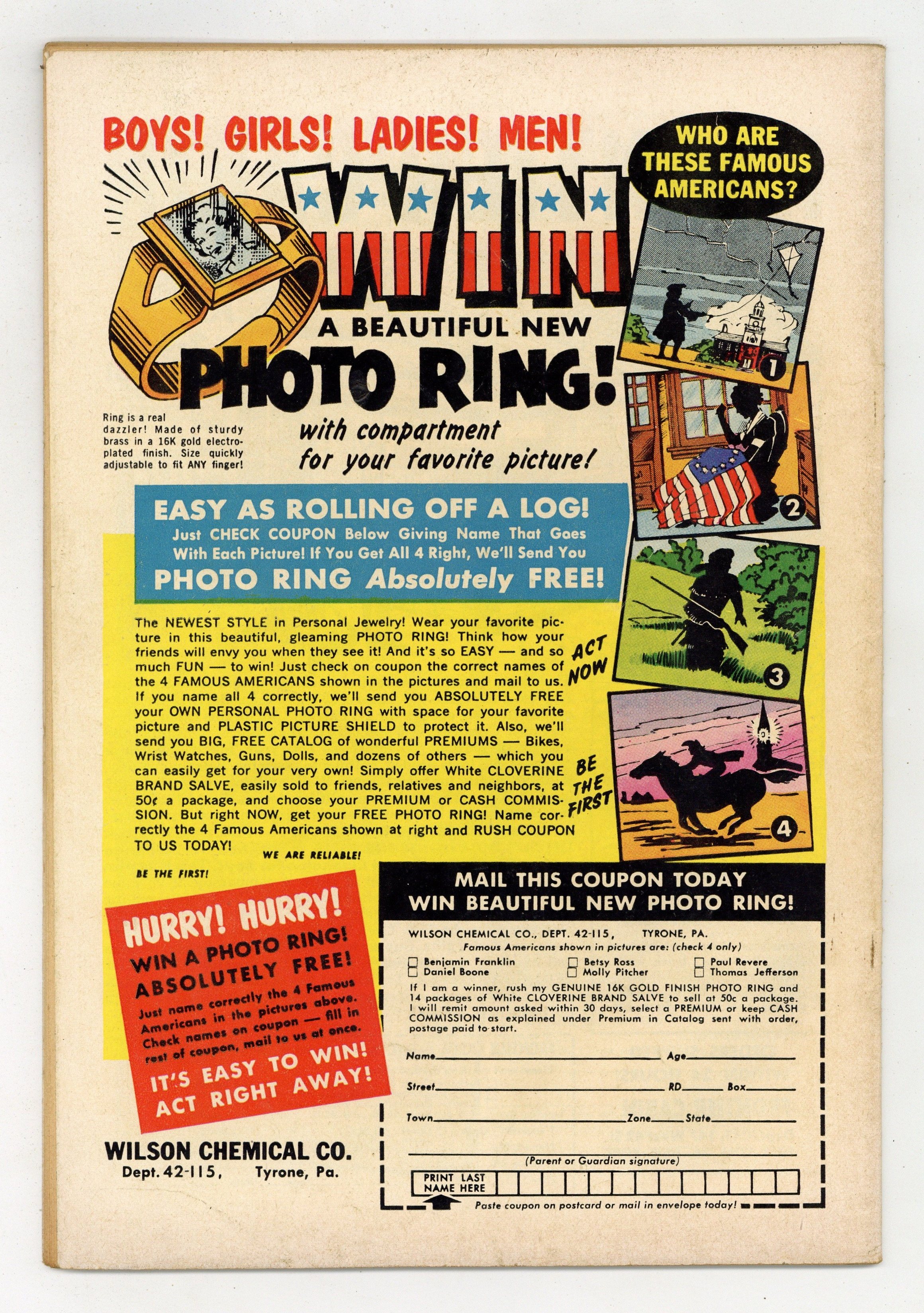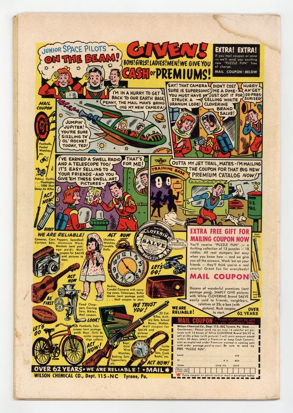Cover by Bill Williams. Stories and art by Hal Seeger and Bill Williams. GI Jane is part of the WACs (Women's Army Corps), allowing her cartoonists, Hal Seeger and Bill Williams, to combine military humor with plentiful good-girl art. Jane thinks her boyfriend Tommy played a prank on her, and her attempt to retaliate leaves her in the men's barracks when the Colonel drops by. Jane's dinner with her grandfather's old college buddy, a general, inadvertently starts a scandal over anti-fraternization rules. A soldier asks Jane to mind his jeep, unaware she's never learned to drive, and comic chaos results. The Impractical Joke; Patti; General Confusion; PX Pete: The Payin' Customer; Jill Jones, WAC: Photo Finish; The Runaway Jeep; The Sarge. 32 pages, Full Color. Cover price $0.10.