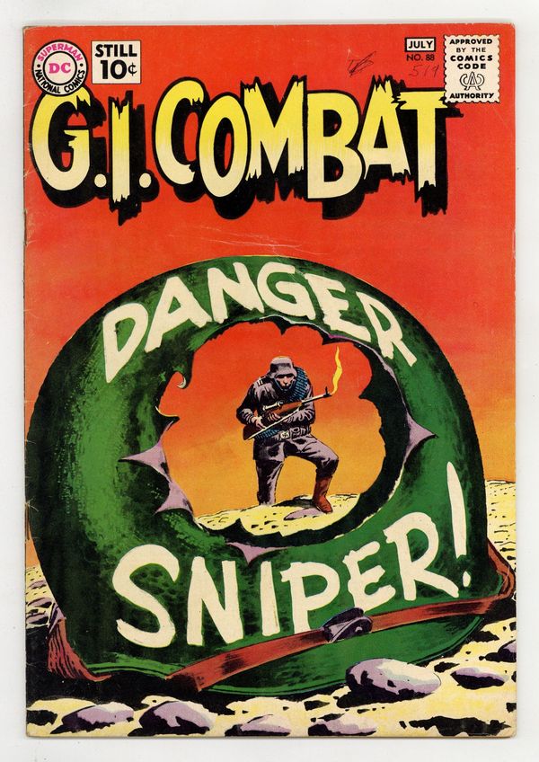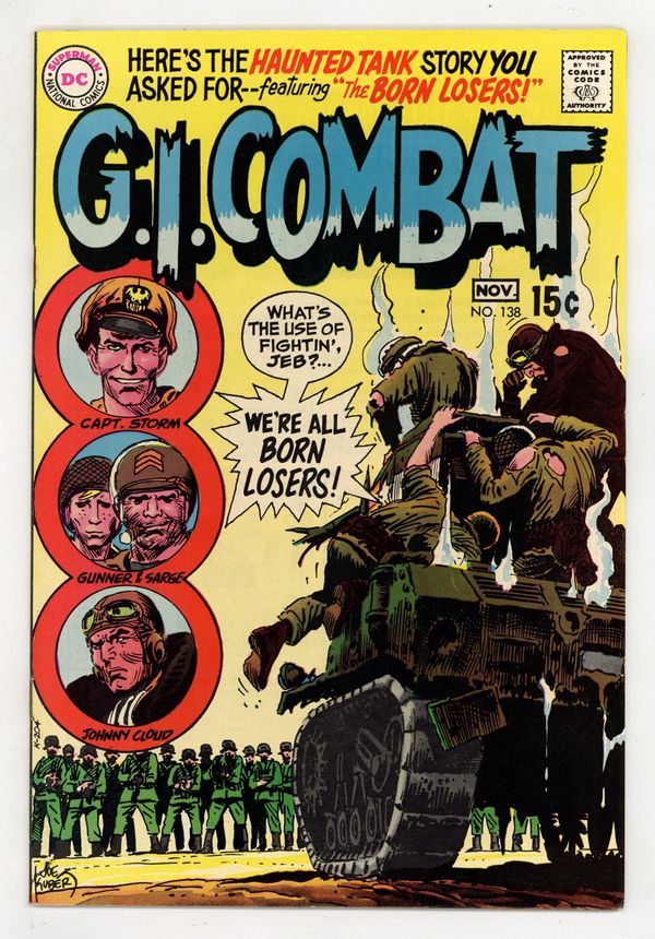 Cover by Joe Kubert. Written by Robert Kanigher and unknown. Art by Russ Heath, Joe Kubert, George Evans and Ken Barr. It's the first appearance of the Losers in the Haunted Tank story "The Losers" by Robert Kanigher and Russ Heath with Joe Kubert. Starring the Haunted Tank, Jeb Stuart, General J.E.B. Stuart, Arch Asher, Rick Rawlins, Slim Stryker and the Losers [Captain Storm, Gunner, Sarge, Johnny Cloud] (introduction as a team). Plus: "Bright Banner," with art by George Evans. And: Warrior 1-pager "Genghis Khan," with art by Ken Barr. 36 Pages, Full Color. Cover price $0.15.