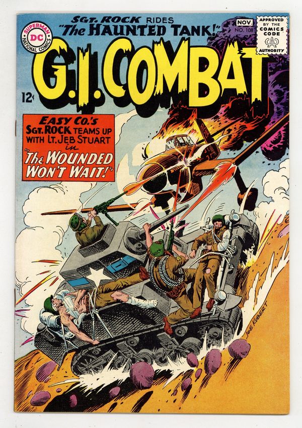 Cover by Joe Kubert. Written by Robert Kanigher and Hank Chapman. Art by Joe Kubert and Jerry Grandenetti. Lt. Stuart is trying to get his three wounded crewmen to an army hospital when he is helped by Sgt. Rock and a couple of Easy Company soldiers. But they are also wounded. Tank commander and sergeant dodge more tanks to reach a field hospital, but it's under fire from an enemy advance in "The Wounded Won't Wait!" by Robert Kanigher and Joe Kubert. Starring the Haunted Tank, Jeb Stuart, Arch Asher, Rick Rawlins, Slim Stryker, General J.E.B. Stuart (ghost), Sgt. Rock and Easy Company [Ice Cream Soldier, Wild Man]. Plus: "Private War!" by Hank Chapman and Jerry Grandenetti. 36 Pages, Full Color. Cover price $0.12.