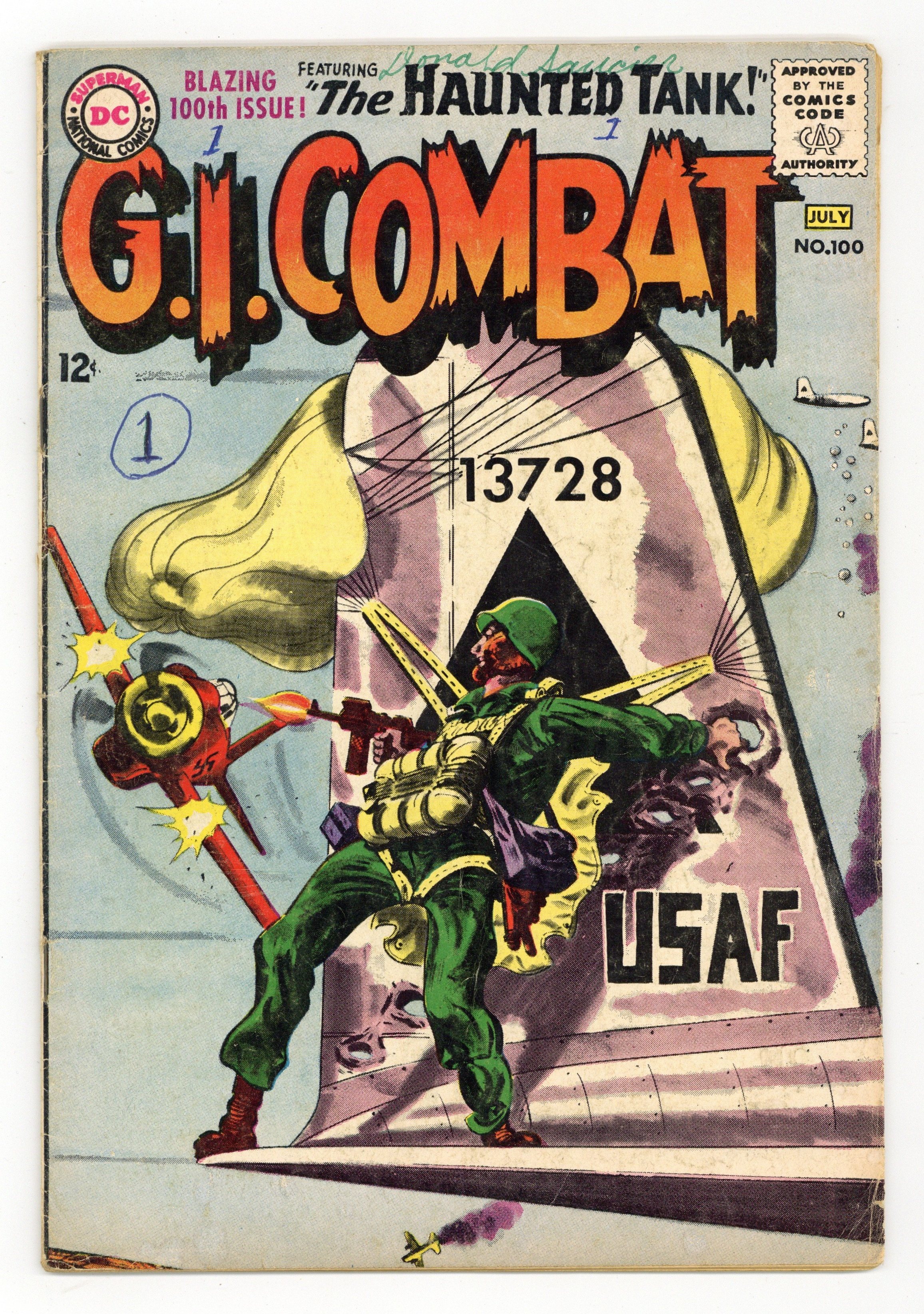 Cover by Jerry Grandenetti and Jack Adler (washtone). Written by Robert Kanigher and Bob Haney. Art by Joe Kubert, Ross Andru, Jack Abel and Mike Esposito. Blazing 100th issue! The crew of the Haunted Tank learns that their fathers had served together during WWI in one of the very first tanks in "Return of the Ghost Tank!" by Robert Kanigher and Joe Kubert. Starring the Haunted Tank, Jeb Stuart, Arch Asher, Rick Rawlins, Slim Stryker and General J.E.B. Stuart (ghost). Plus: "The Glory Box of Charlie Company!" by Bob Haney, Ross Andru and Mike Esposito. And: "The Big Jump!" by Kanigher and Jack Abel. 36 Pages, Full Color. Cover price $0.12.