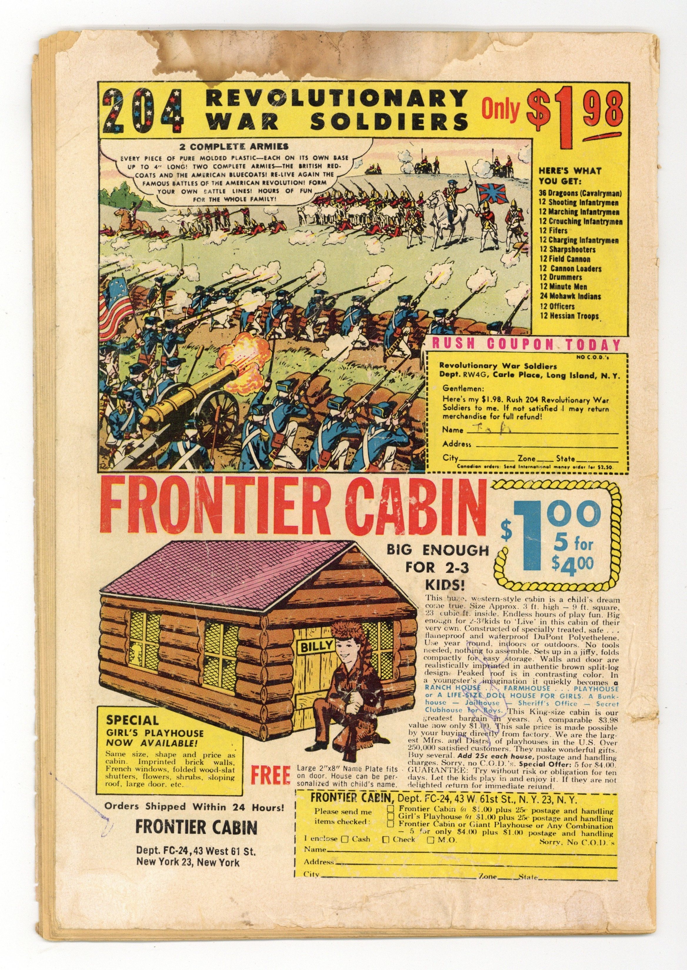 Cover by Russ Heath. Written by Robert Kanigher and Hank Chapman. Art by Russ Heath and Jack Abel. General J.E.B. Stuart tells the story of the first time he watched over Lt. Stuart and his crew as they landed for the first time in Northern Africa and learned how to fight in "Battle Origin of the Haunted Tank!" by Robert Kanigher and Russ Heath. Starring the Haunted Tank, Jeb Stuart, Arch Asher, Rick Rawlins, Slim Stryker, General J.E.B. Stuart (ghost), Alexander the Great (ghost), Julius Caesar (ghost), Napoleon (ghost) and Admiral Nelson (ghost). Plus: "My Witness -- the Enemy!" by Hank Chapman and Jack Abel. 36 Pages, Full Color. Cover price $0.12.