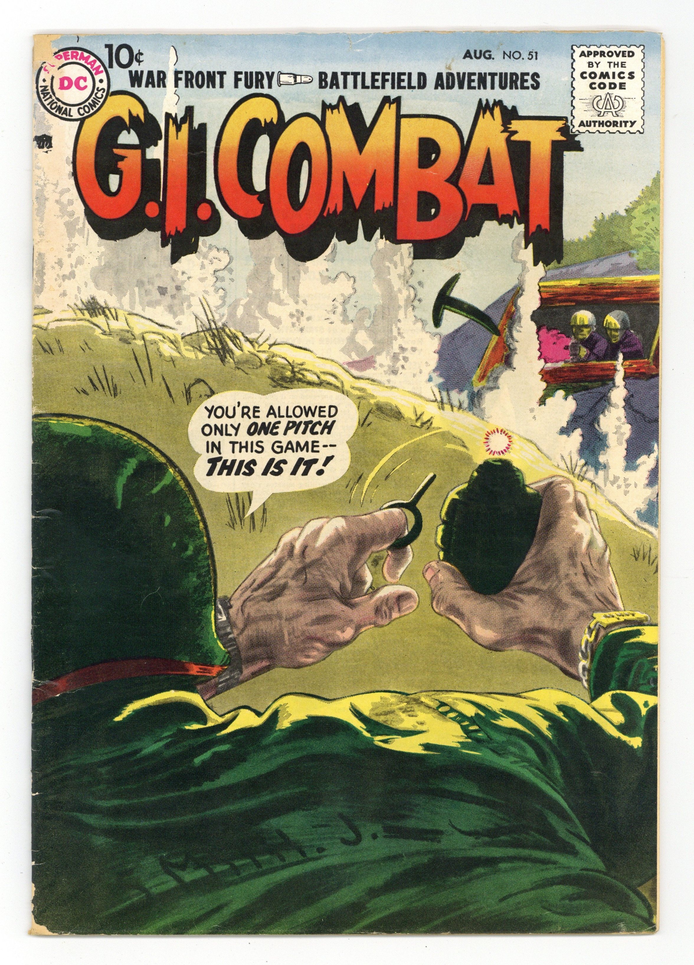 Cover by Jerry Grandenetti. Written by Robert Kanigher, Bill Finger, Ed Herron and Bob Haney. Art by Jerry Grandenetti, Ross Andru, Irv Novick, Russ Heath and Mike Esposito. War front fury! Battlefield adventures! You're allowed only one pitch in this game...and this is it! Don't miss..."The Walking Grenade!" by Robert Kanigher and Jerry Grandenetti. Also in this issue: "Desert Stand!" by Bill Finger, Ross Andru and Mike Esposito; "Bunker Hill Beachhead!" by Ed Herron and Irv Novick; and "Jump-Off Town!" by Bob Haney and Russ Heath. 36 Pages, Full Color. Cover price $0.10.