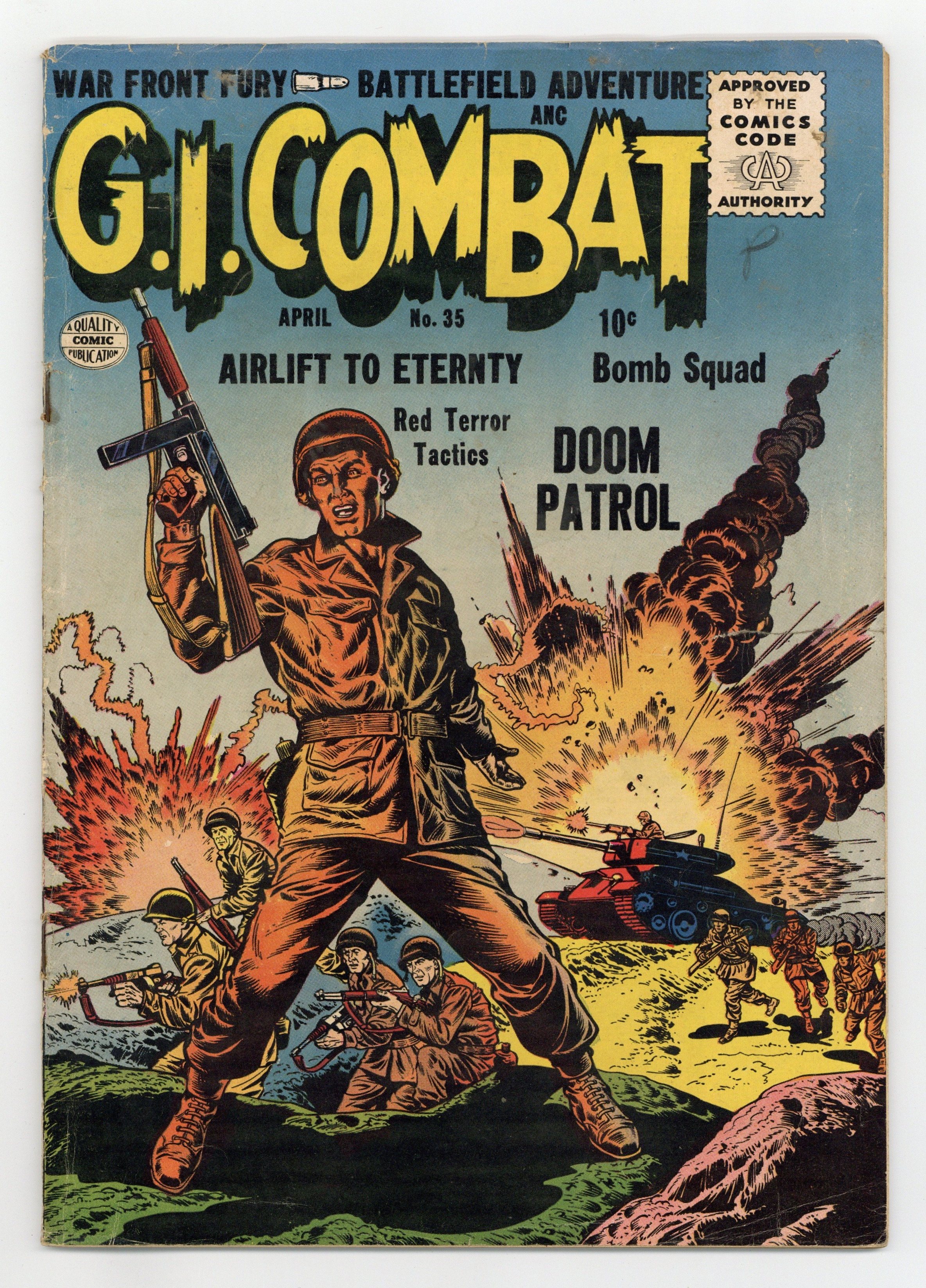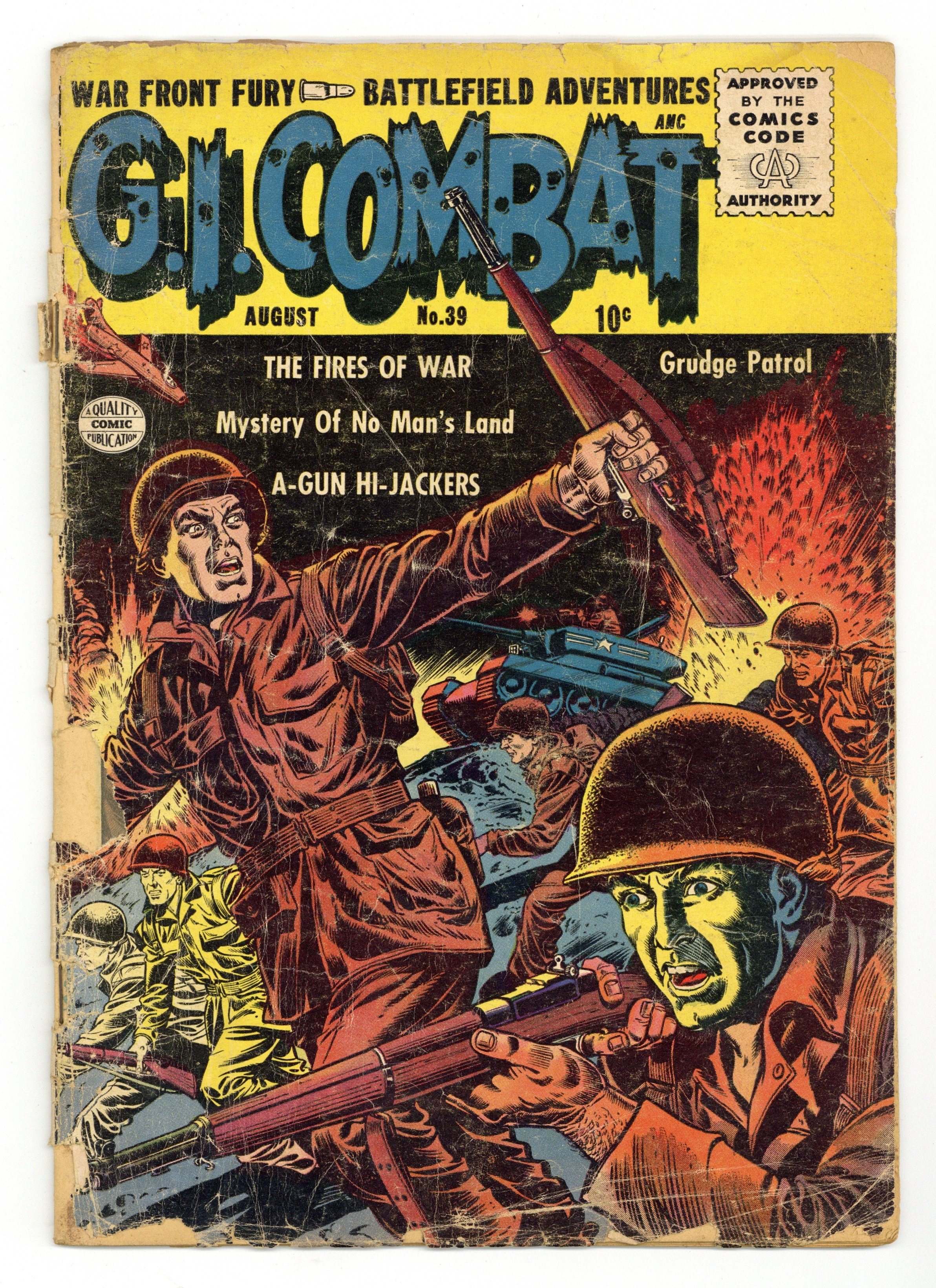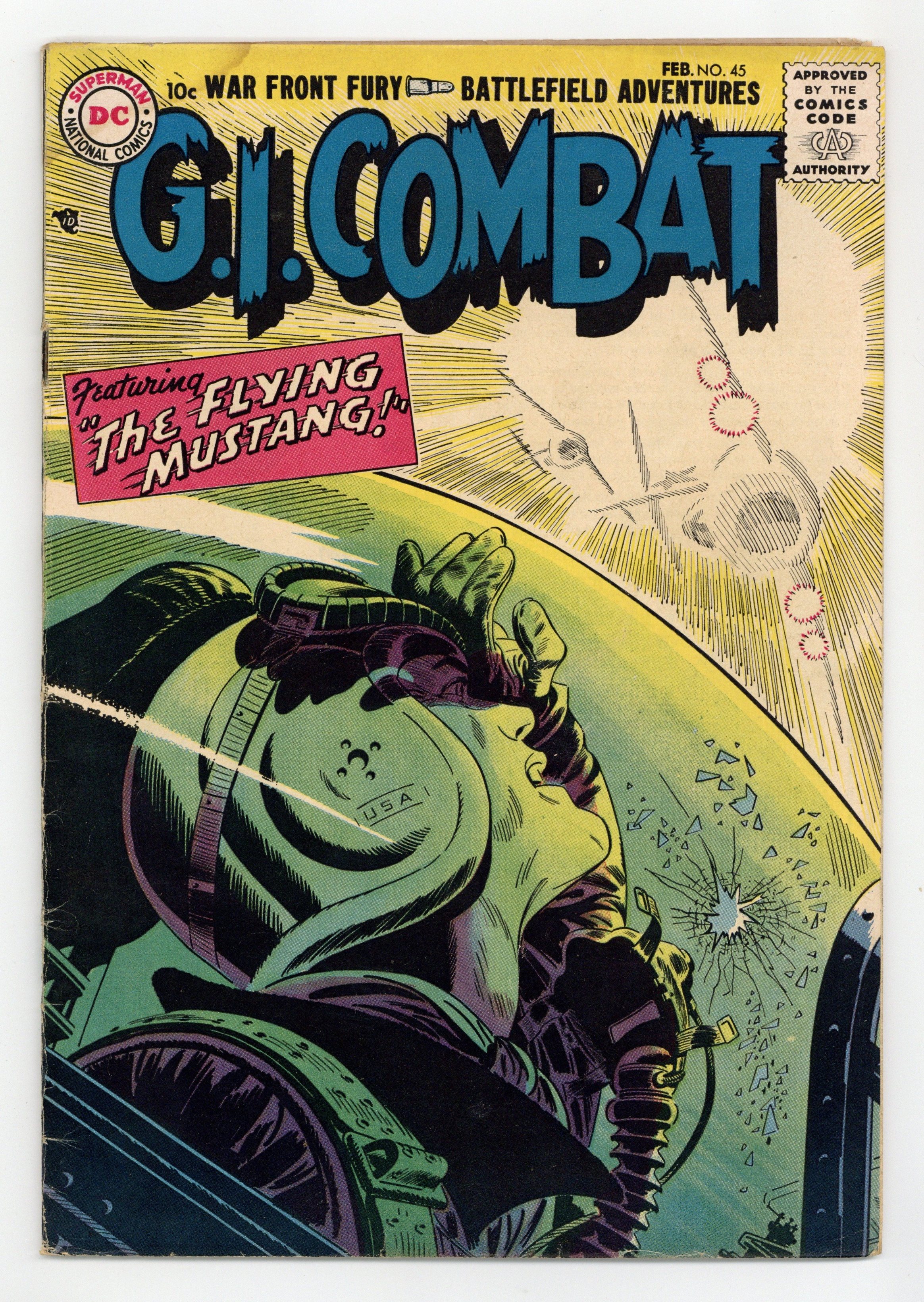 March 1956: Cover by Dick Dillin and Charles Cuidera; "Firepower Assault," 7 pages (reprinted from G.I. Combat #7); "End of a Coward," 6 pages, art by Reed Crandall (reprinted from G.I. Combat #5, original title was "Death of a Coward); "Red Train to Doom," 7 pages, art by Reed Crandall (reprinted from G.I. Combat #8, original title was "Red Train to Hell); "The Perfect Plan," 1 page text story; "Heroes fo the Sky," 6 pages (reprinted from G.I. Combat #5, original title was "Glamour Guys of Hell" and was rewritten to bring it up to the Comics Code). 36 Pages, Full Color. Cover price $0.10.