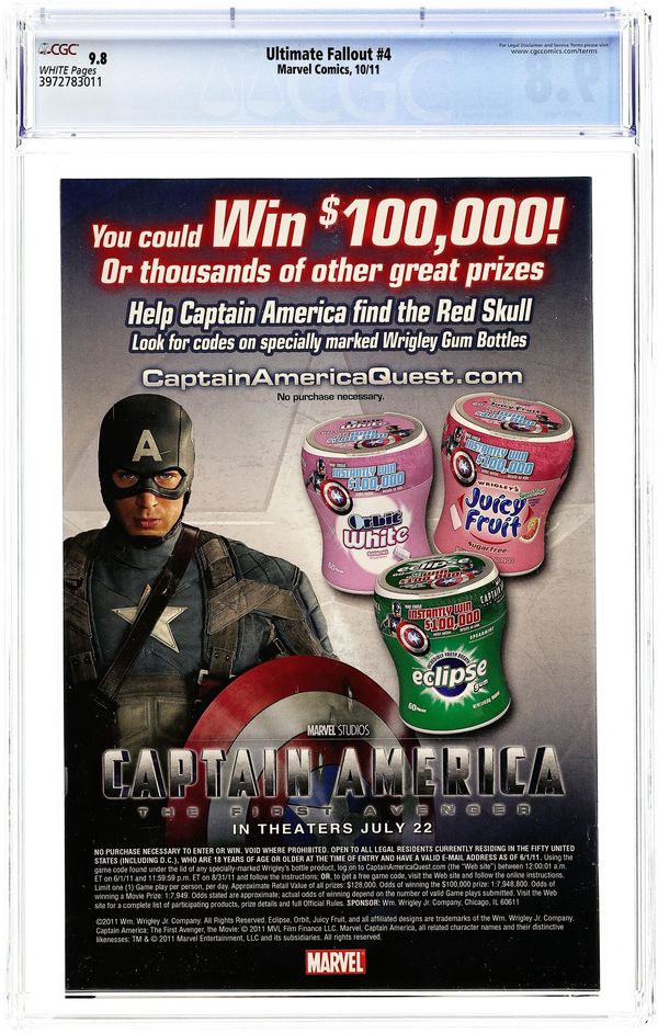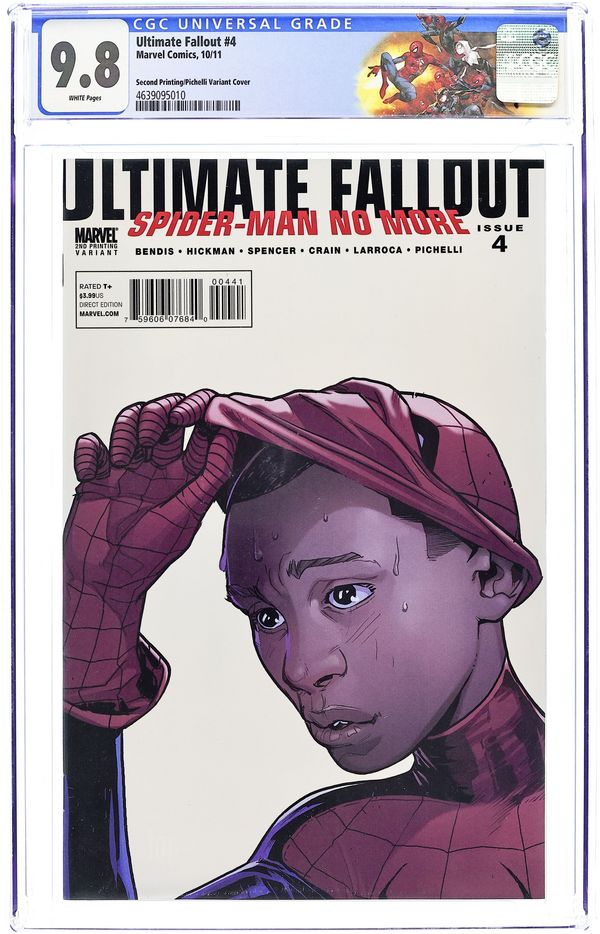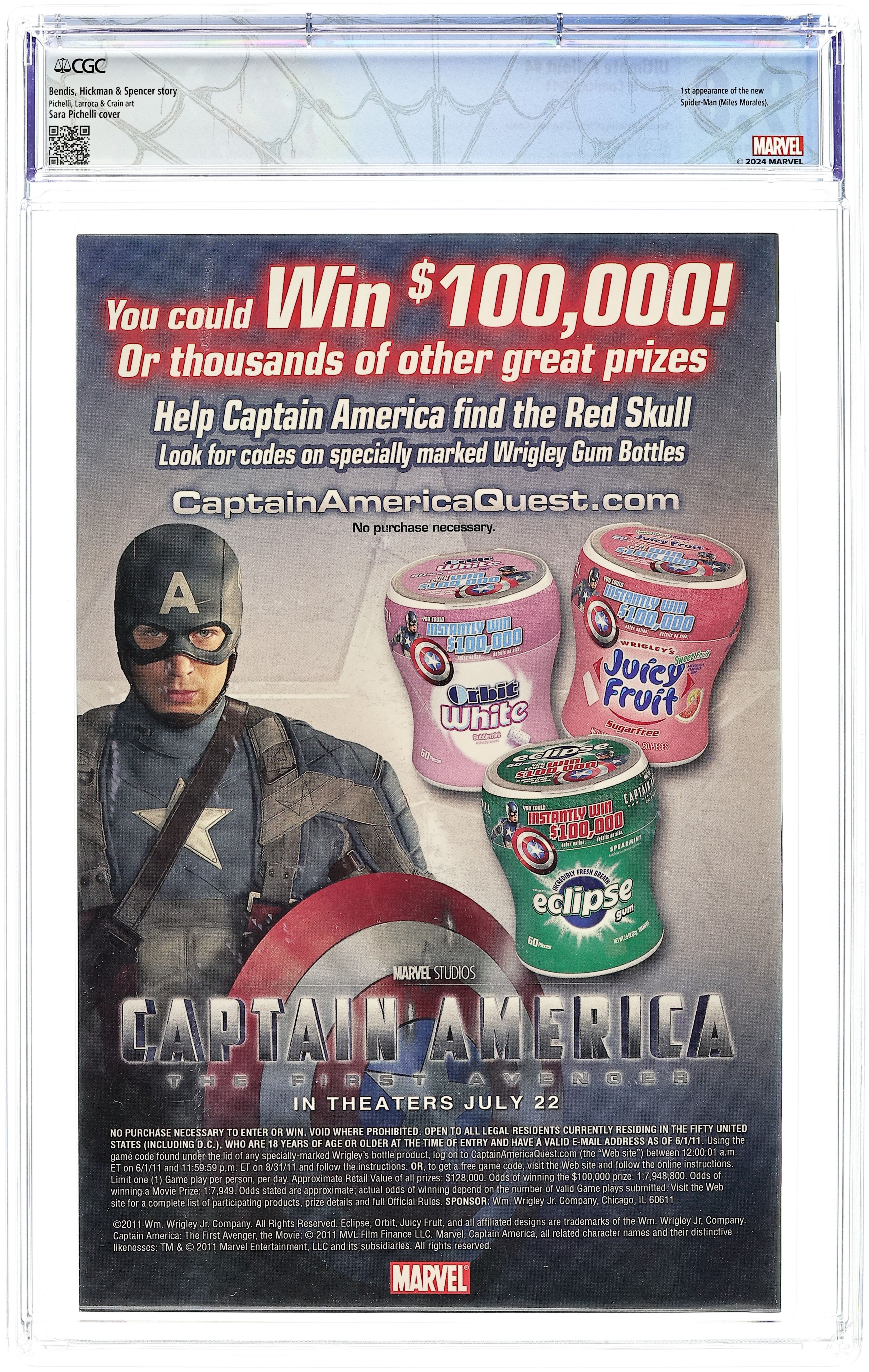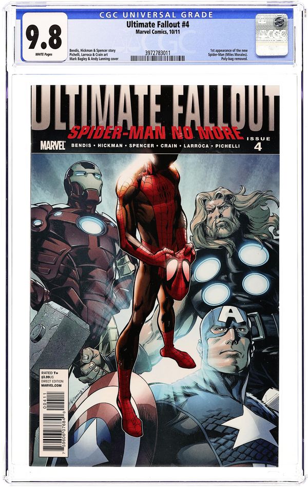 Direct Edition. 1st appearance of Miles Morales. Written by BRIAN BENDIS, JONATHAN HICKMAN & NICK SPENCER. Art by SARA PICHELLI, SALVADOR LARROCA & CLAYTON CRAIN. Cover by MARK BAGLEY. What will become of Captain America? Where have all the X-Men gone? And what is up with the new Spider-Man suit? Don't miss the final chapters of one of the most talked about Ultimate events ever. 36 PGS. (each)/Rated T+...$3.99 (each) Cover price $3.99.