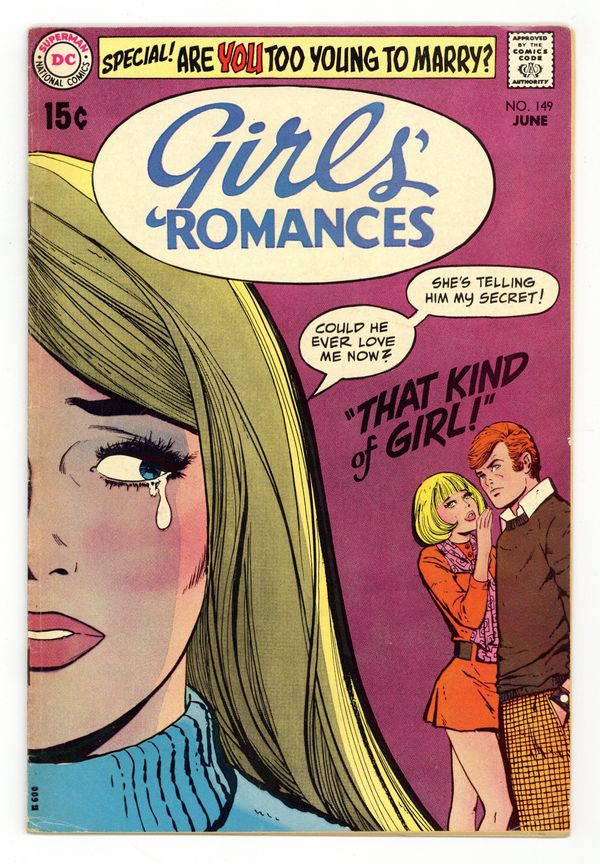 Featuring: 13 page story "That Kind of Girl!" drawn by Ric Estrada and Vince Colletta; 2 page What's Your Dating I.Q.? relationship quiz pencilled by Ric Estrada; 8 page story "You Can't Lie About Love" drawn by Mike Sekowsky and Bernard Sachs; 2 page text article "Are You Too Young to Marry?" (with illustrations inked by Bernard Sachs); 5 page story "Too Good to be Loved" drawn by Murphy Anderson; 1 page Julia Roberts, Romance Counselor letters page. Cover inks by Vince Colletta. Cover price $0.15.