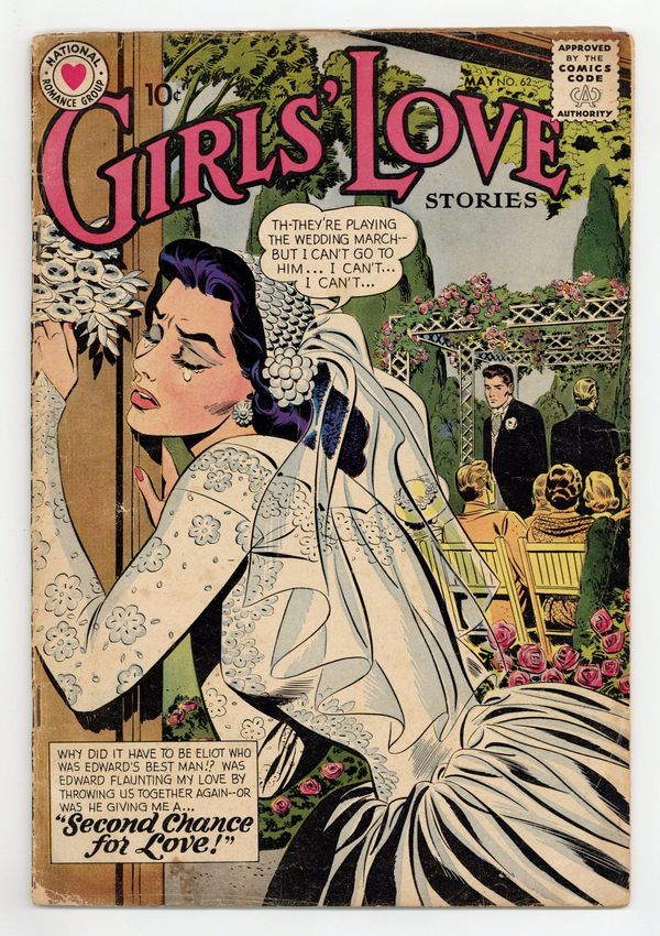 Was she marrying the wrong man? "For Better or for Worse" is the cover-featured 8 page story pencilled by John Romita, Sr. Plus: 7 page story "Duel of Hearts"; 7 page story "Love is a Sudden Thing"; 1 page story "Love Song" (story of poets Robert Browning and Elizabeth Barrett); 7 page story "A Secret to Share"; 2 page From Barbara Miles, with Love letters page; 1 page story "Charm in Romance." Cover pencils by John Romita, Sr. Cover price $0.10.