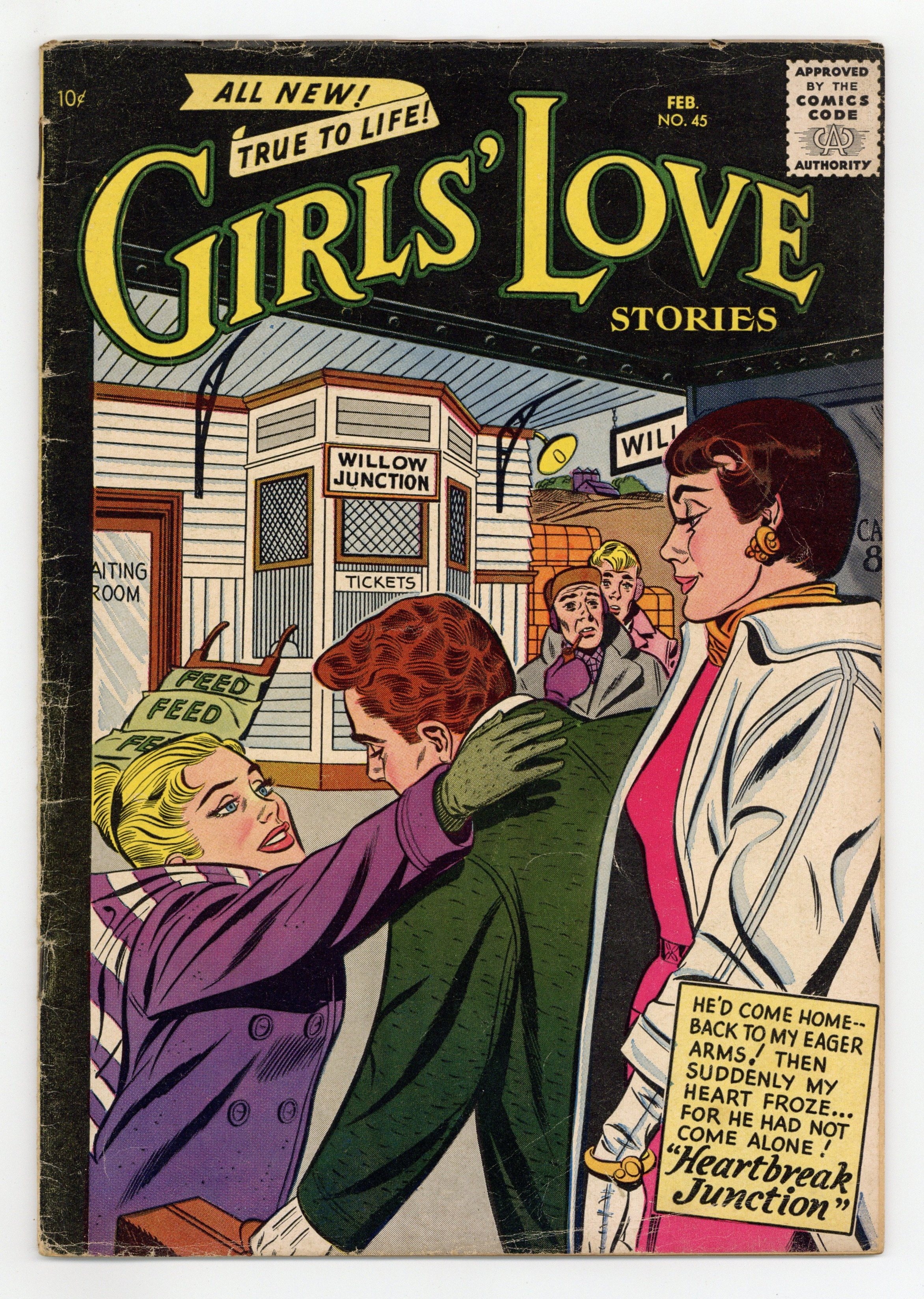 He'd come home...back to her eager arms! Then suddenly, her heart froze...for he had not come alone! "Heartbreak Junction" is the cover-featured 8 page story. Plus: 7 page story "Portrait of Love"; 7 page story "Clash of Hearts"; 1 page Peg filler "Charm School" by Henry Boltinoff; 7 page story "Rich Man, Poor Man"; 2 page text story "The Girl in the Dream"; 1 page Jerry Jitterbug filler "Gift of Cheese Sandwiches" by Henry Boltinoff. Cover price $0.10.