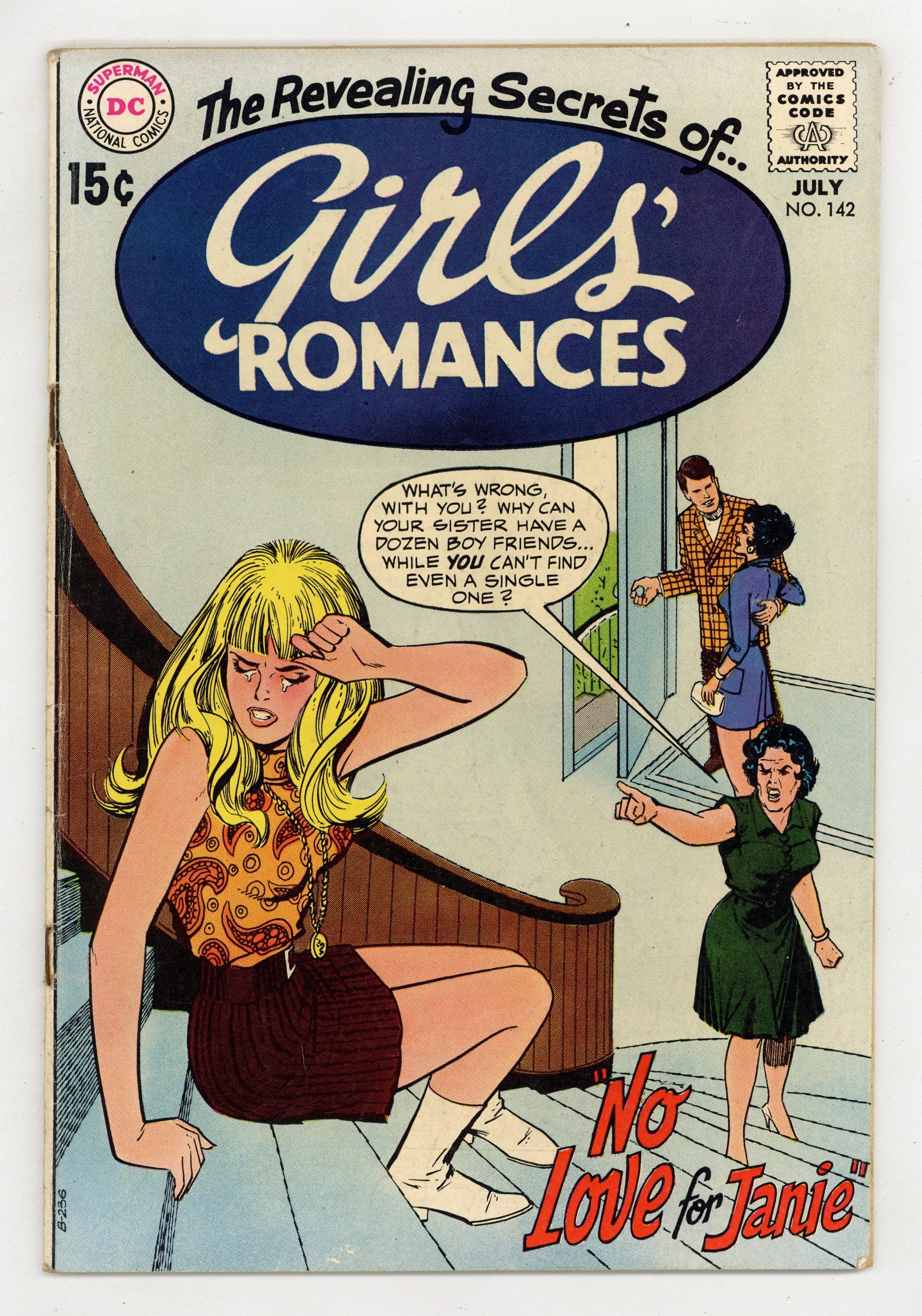 What's wrong with Janie? Why can her sister have a dozen boy friends...while she can't find even a single one? "No Love for Janie" is the cover-featured 9 page story drawn by Jay Scott Pike and Vince Colletta. Plus: 9 page story "Possessed by My Love" drawn by Win Mortimer and Vince Colletta; 2 page Mad Mad Modes for Moderns filler; 1 page Julia Roberts, Romance Counselor letters page; 3 page story "Betty's Boutique" pencilled by John Rosenberger; 7 page reprint story "Meant for Each Other" drawn by Arthur Peddy and Bernard Sachs. Cover price $0.15.
