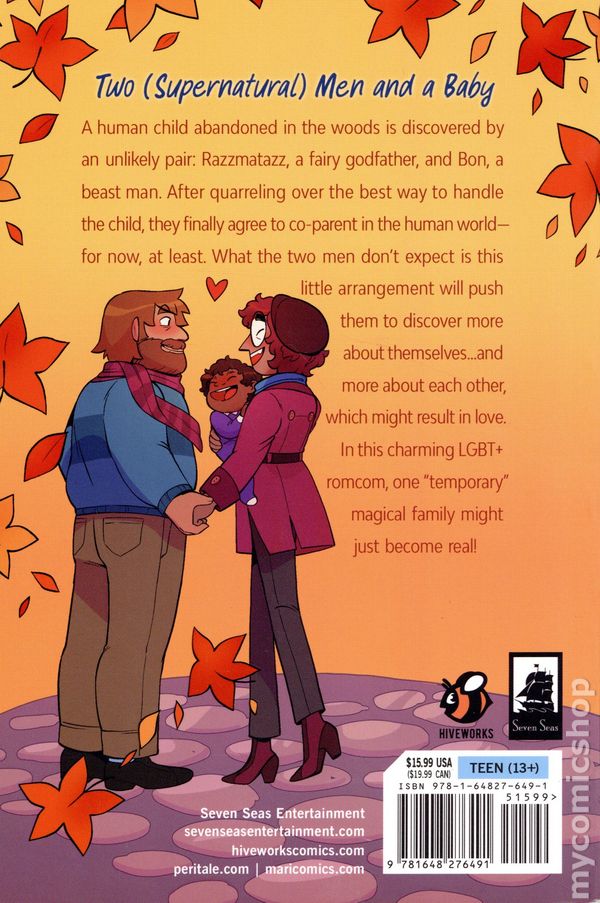1st Printing. Story, art, and cover by Mari Costa. A human child abandoned in the woods is discovered by an unlikely pair: Razzmatazz, a fairy godfather, and Bon, a beast man. After quarreling over the best way to handle the child, they finally agree to co-parent in the human world–for now, at least. What the two men dont expect is this little arrangement will push them to discover more about themselves…and more about each other, which might result in love. In this charming LGBT+ romcom, one temporary magical family might just become real! Softcover, 5 1/2-in., x 8 1/2-in., 192 pages, full color. Cover price $15.99.