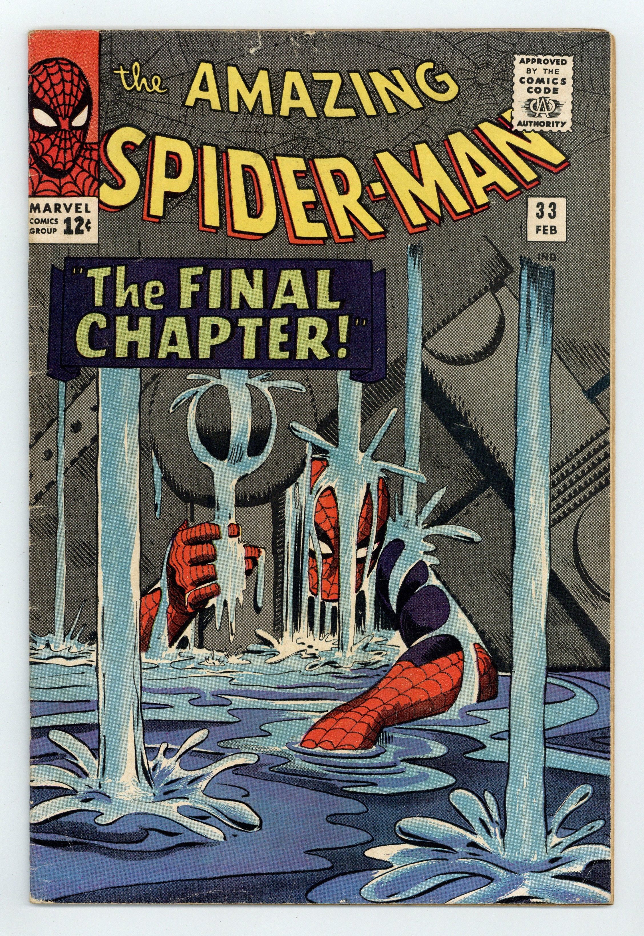 Cover art by Steve Ditko. The Final Chapter!, script by Steve Ditko (plot) and Stan Lee (script), art by Steve Ditko; Trapped under a pile of rubble in an underwater base that is filling with water, Spidey has to use all of his strength and determination to break himself free as Aunt May's life hangs in the balance; Spidey escapes and takes down Doc Ock's goons so he can deliver a serum that will remove the radiation from his Aunt's system. One of Spidey's classic moments is captured in the first 5 pages as he struggles to escape from underneath tons of steel! Reprinted in Marvel Tales # 26 and 172. 36 pgs. $0.12. Cover price $0.12.