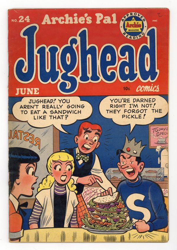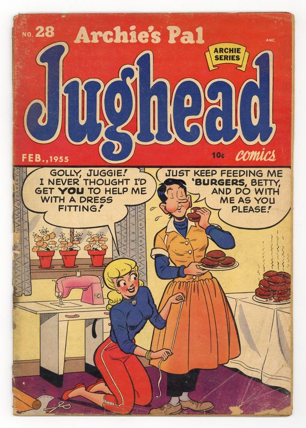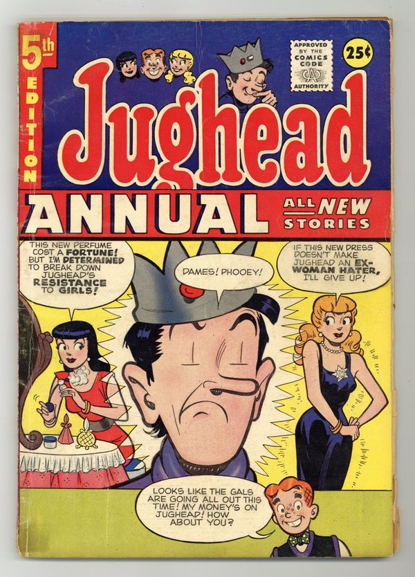 "All's Yell That Ends Yell," script by Frank Doyle, pencils by Harry Lucey, inks by Joe Edwards; After hearing Jughead scorn women once again, Betty decides to pull one of Reggie's pranks on him. "Just Desserts," inks by Terry Szenics; Moose overhears Reggie and Midge disparage a dessert and think they're talking about him. "Package Deal"; Moose strong-arms Jughead into helping him wrap Christmas presents. "Letter Alone," pencils by Bill Vigoda; Reggie tricks Jughead into reading a steamy love letter in front of the English class. "Legal, But Tender," script by Frank Doyle, pencils by Harry Lucey; Archie and Reggie suspect Jughead of counterfeiting U.S. currency. "Trick or Treat," art by Samm Schwartz; Tired of wisecracks about their cooking, Betty and Veronica force Archie and Jughead to cook a meal on their own. "Door Frame," art by Bill Vigoda; Jughead invents an automatic garage door opener with one tiny side effect. "The Eyes Have It," pencils by Dan DeCarlo, inks by Rudy Lapick; Jughead gets a black eye from running into a door and nobody will believe him. 100 pgs., full color. Cover price $0.25.