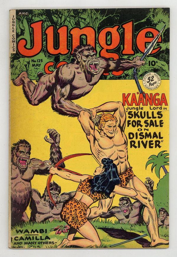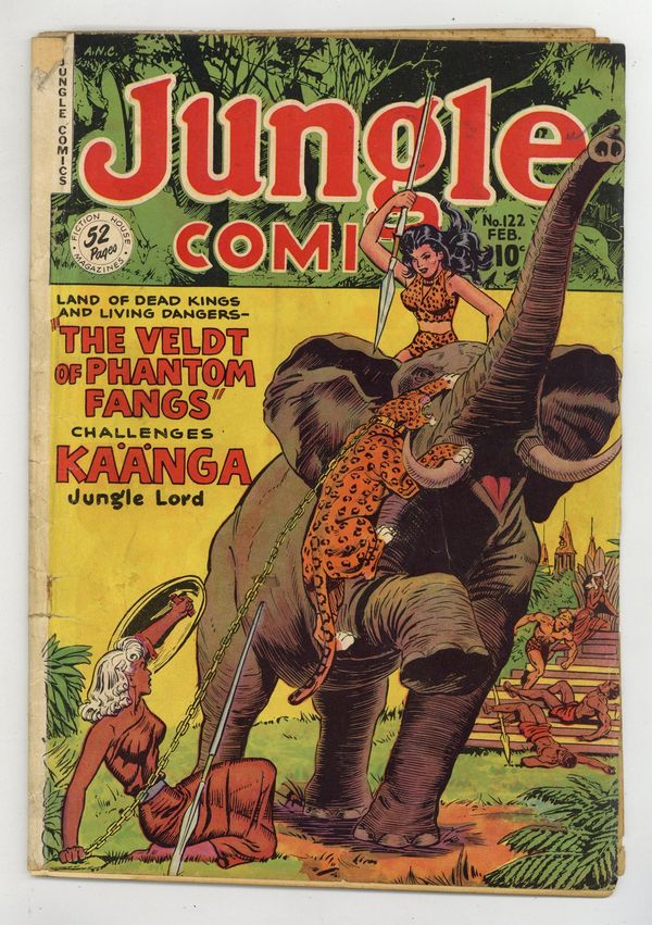 Cover art by John Celardo. "The Trek of the Terror-Paws," art by John Celardo; Kaänga comforts a dying archaeologist and takes the gift the old man gives him, a small idol; Later, criminals come looking for the idol, certain that it contains jewels; Kaänga dumps the thieves into a quicksand pit and reveals to Ann that he had taken the jewels from the idol to raise money to help feed N'geeso's people. Untitled story, pencils by Matt Baker; Archaeologist Winters is wounded by his guides when they decide to take the treasures of the Temple of K'nassa for themselves; Winters' daughter secures the help of Camilla against the thieves and the treasure is committed to a museum. Untitled story, art by Richard Case; During a drought, Simba leads his followers to a water hole ruled by another lion; He and Bordag, the other lion, fight to the death, with Simba triumphant. "The Avenging Torch" text story. Untitled story starring Captain Terry Thunder, art by Dan Zolnerowich; Garson and his gang, hoping to loot the native villages come to the jungle claiming to carry insecticide for tsetse flies, but in reality carrying knockout gas. Untitled story, art by Henry Kiefer; Chief Asama's hunters trick Wambi into blowing a hunting horn that attracts the local buffalo, several of which are captured; The animals of the jungle accuse Wambi of being in league with the hunters; Wambi sets out to prove his innocence and goes to the hunters' sacred cave, where the buffalo are to be sacrificed. Jungle Facts, art by August Froehlich; A description of the natural resources of the Belgian Congo. Untitled story, art by Maurice Whitman; The ghost of the late queen, Lara speaks to Tabu, telling him that she was murdered by the witch doctor Karoa and that the wizard intends to kill her son, as well; Tabu confronts the witch doctor and exposes his crimes to the villagers, who sentence him to death. 52 pgs., full color. Cover price $0.10.