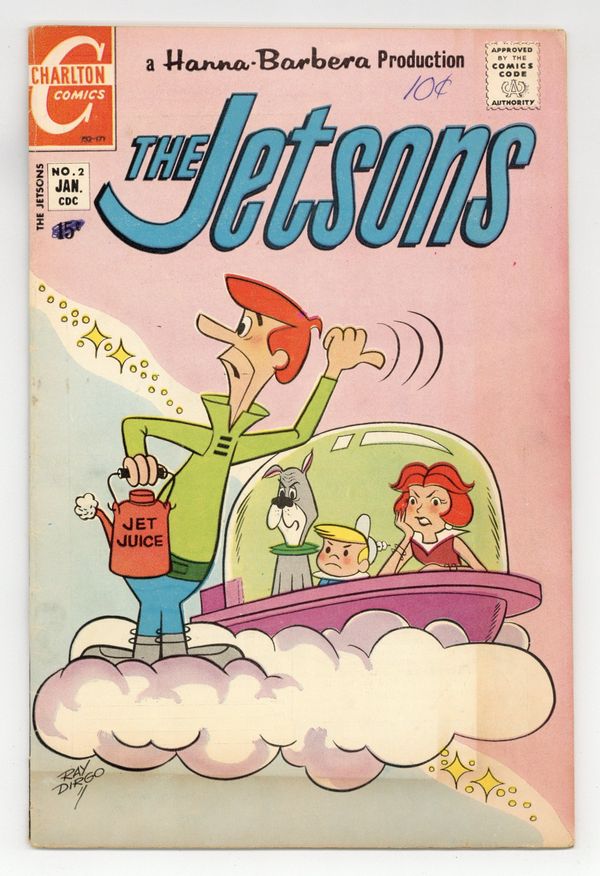 Cover by Ray Dirgo. Stories and art by Joe Gill, Fred Himes, and Ray Dirgo. A glimpse at the future through the lens of the 1960s, The Jetsons revealed that the basic frustrations of life never change. After George gets swindled out of phony gold stocks, the family comes to his rescue. Judy falls hard for a Venusian rock star, but it turns out to be just a smellovision allergy. Jane goes to the doctor for her bad back. Gold by Jupiter!; A Knutty Problem; Judy Finds Love on Venus!; An Idol Called Car; Winky and Stinky; Oh, Doctor! 32 pages, Full Color. Cover price $0.15.