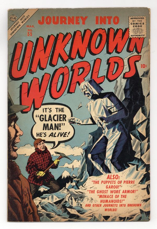 Cover art by Bill Everett. "The Ice Monster Cometh!", art by Gene Colan; A woman who scoffs at local tales of an 'ice monster' plots to get rid of her husband and pin the blame on the 'ice monster'; She has the tables turned on her when the accomplice she picks to aid her in her crime reveals himself to be...the Ice Monster. "The Lost City," pencils by Sheldon Moldoff; A pilot finds himself in a lost city at the ocean floor while charting a hurricane where men have their mouths sewn shut in order to prevent them from telling the secret. "The Woman Who Was Afraid of Birds" text story. "Harry's Hideout," art by Carl Hubbell; A murderer seeks a hiding place and unknowingly enters a time capsule. "Tough Guy," art by John Rosenberger; Bart Nelson is too tough for the demons of hell--nothing they do to him has any effect until they come up with a rather unique torment. "The Great Disappointment!", script by Stan Lee, art by Russ Heath; A Soviet expedition lands on the moon, but the cosmonauts are absorbed into the surface; American scientists observing this admit that they knew that the moon was a dangerous living organism, which is why they allowed the Soviet Union to reach it first. 36 pgs., full color. Cover price $0.10.