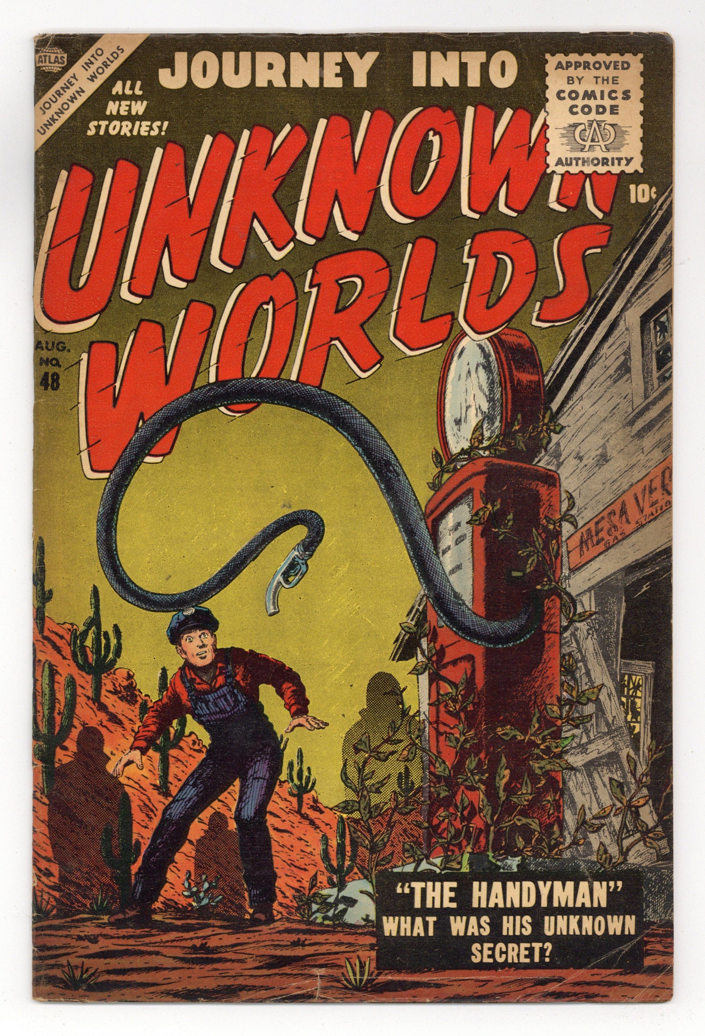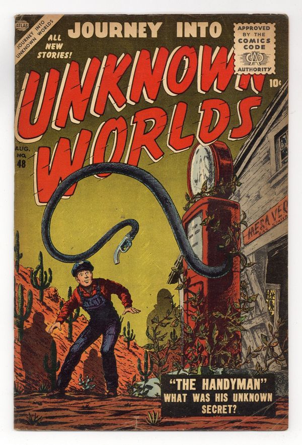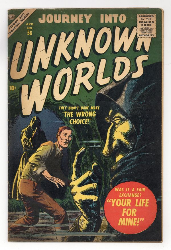 Cover by Carl Burgos. Stories by Carl Wessler and unknown. Art by Richard Doxsee, Frank Bolle, Joe Maneely, Mort Drucker, Sol Brodsky, Ross Andru and unknown. How can a ship be sinking in a sea of grass? Don't miss..."Graveyard" with art by Richard Doxsee. Also in this issue: "Who Waits in the Fog!" with art by Frank Bolle; "Age of the Iron Men!" by Carl Wessler and Joe Maneely; "The Thought Stealer!" by Carl Wessler and Mort Drucker; "He Hides By Night!" with art by Sol Brodsky; "I Dare You to Move!" with pencils by Ross Andru; and 2-page text story "The Little Green Man," reprinted from Strange Tales (1951-1976 1st Series) #51 (original title: "Over the Moon"). 32 pages, full color. Cover price $0.10.