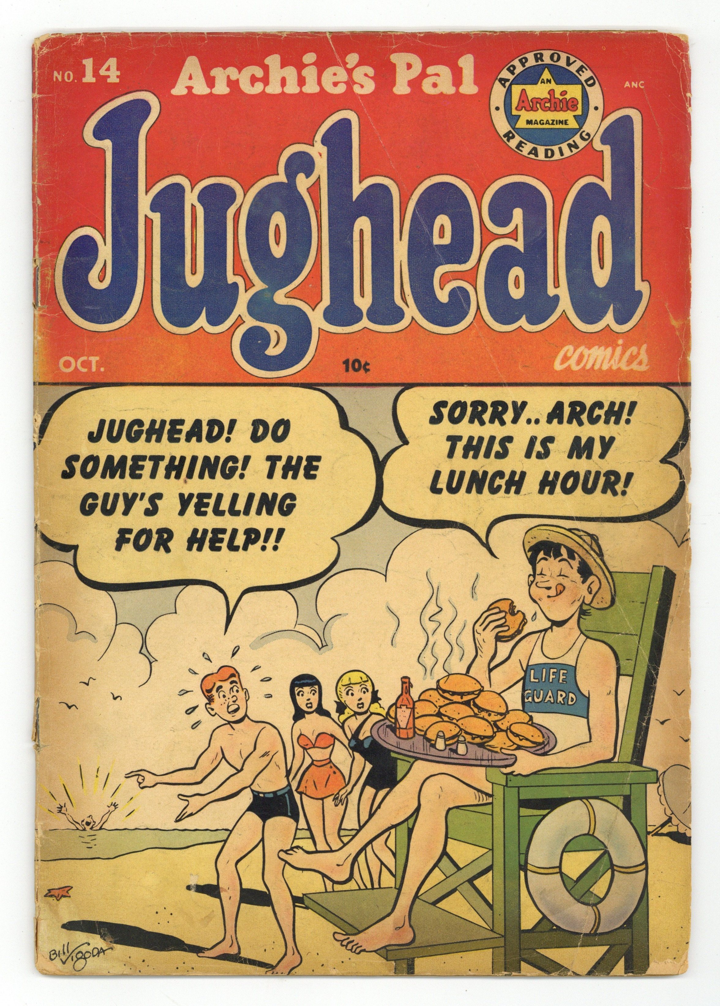 Cover art by Bill Vigoda. "We Want A Re-Count"; Jughead wins every category in the school favorites because he voted for himself enough to win a majority. "Labor Of Love"; Pop Tate hires Jughead to be a soda jerk, but Jughead doesn't make a very good worker. "Leaf Me Alone"; Mr. Weatherbee offers a day off of school for the student who will rake the leaves; Jughead piles the leaves and starts to burn them; The smoke goes straight into Mr. Weatherbee's office. "Spellbound"; Reggie pronounces the word "xenodochein" and asks Archie to spell it backwards, so Archie spells "it" backwards. "Party Line"; Jughead's father encourages him to be more social since it's his birthday; He overhears his friends planning his surprise party; He invites everyone to the Chok'lit Shoppe that night. 36 pgs., full color. Cover price $0.10.