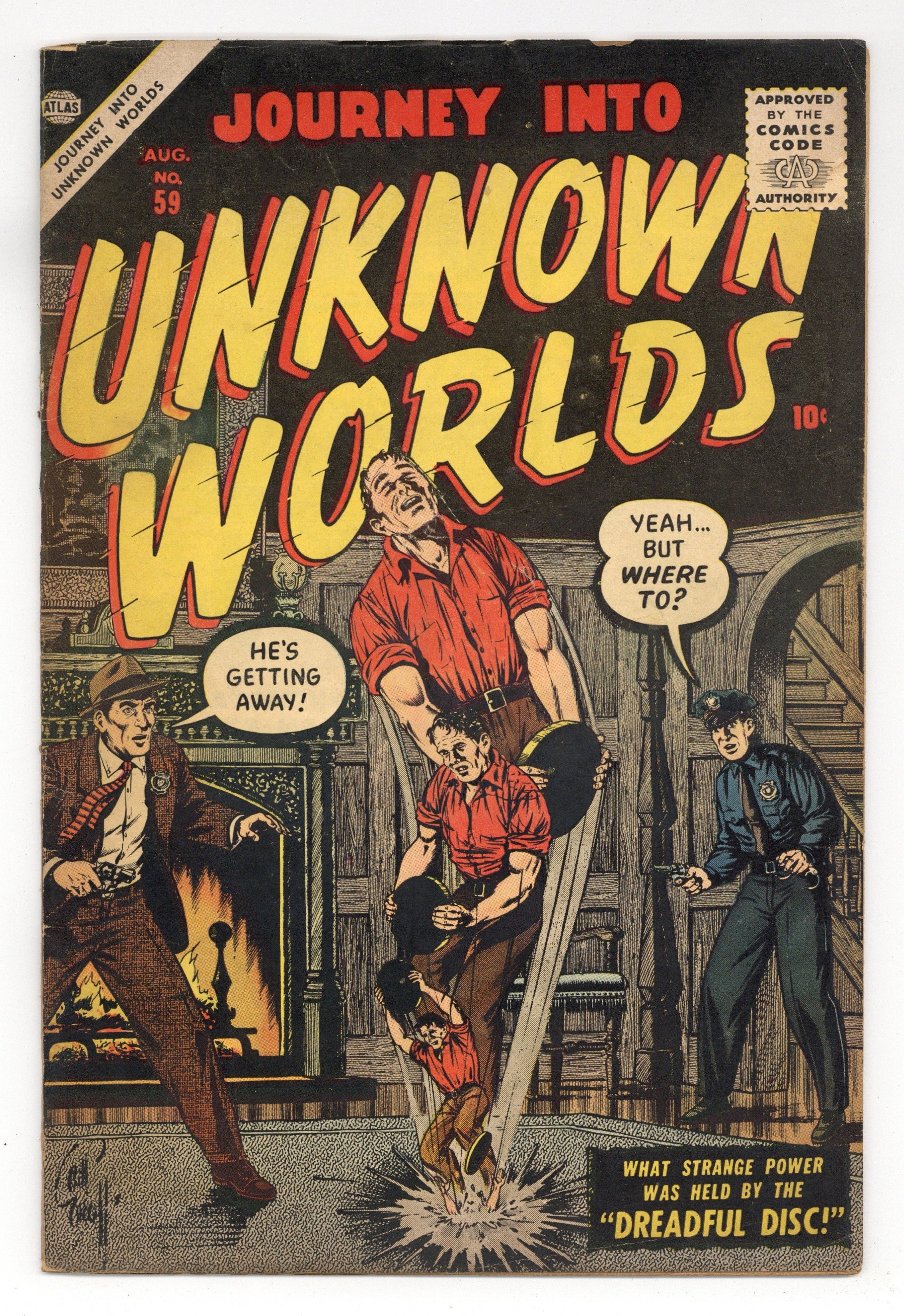 Cover pencils by Bill Everett. The Dreadful Disc!, art by John Forte; A thief uses a disc that reduces his height to ten inches so his pursuer catches him with a mousetrap. I Wake Up Screaming, art by Richard Doxsee; When a criminal attempts to start over as an amnesia victim by altering his looks and using hypnosis to implant a mental block, the doctors trip him up by creating a fantasy wherein he must save the person he cares most about and he screams out his own name. Shock at Seven O'Clock, pencils by Ted Galindo; The ten year anniversary of a pirate attack signals doom for the pirate captain and his crew as the ghosts from an old victim catch up with them. The Strange Warning!, art by Ruben Moreira; A businessman has a premonition about a plane going down that saves his life. Out of this World text story. A Shaggy Wolf Tale!, pencils by Al Williamson. The Man Who Lived Twice!, pencils by Al Eadah. 36 pgs. $0.10. Cover price $0.10.