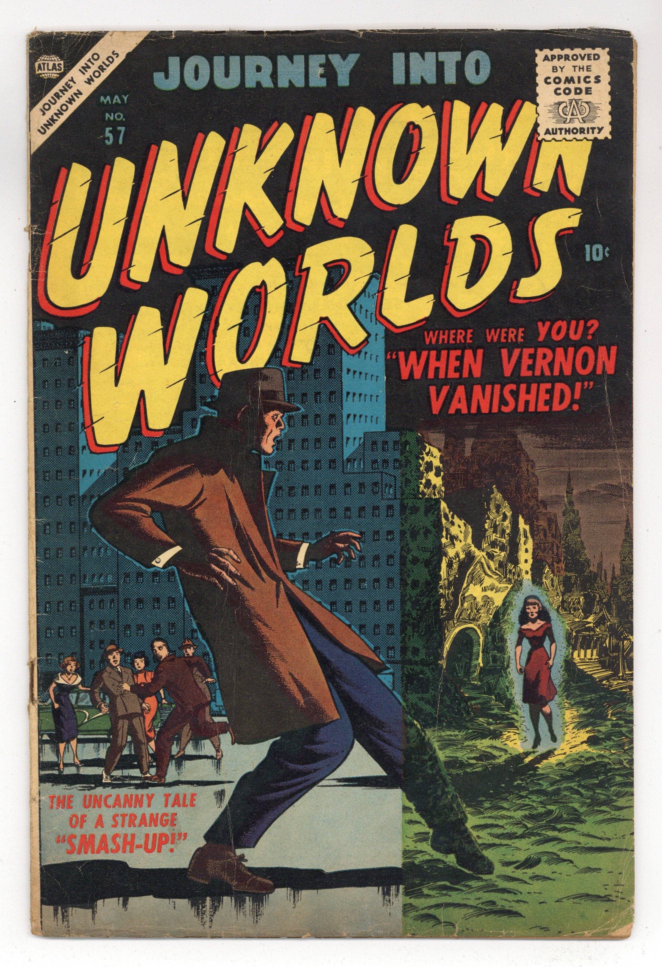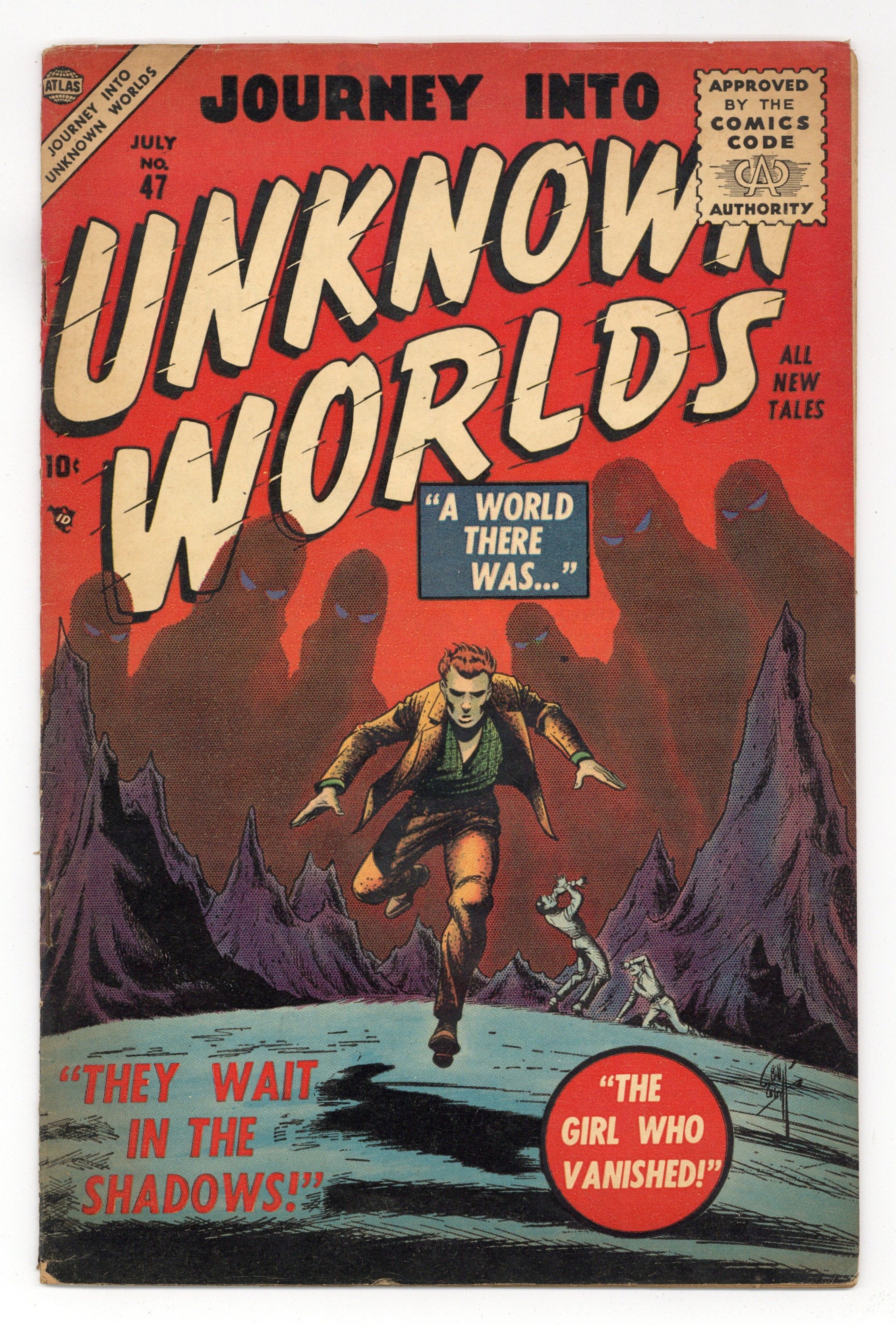 Stories by Carl Wessler and unknown. Art by Joe Orlando, Syd Shores, Marvin Stein, Ed Winiarski, Fred Kida, Richard Doxsee and unknown. In this issue: "The Man in Black!" with art by Joe Orlando; "Smash-Up!" with pencils by Syd Shores; "The Man Who Stole the Sun!" with art by Marvin Stein; "When Vernon Vanished" by Carl Wessler and Ed Winiarski; "It Happens at Night!" with art by Fred Kida; "Someone Is Following" with art by Richard Doxsee; and 2-page text story "Precious Marble," reprinted from Mystic (1951 Atlas) #49 (original title: "Lost Marble"). 32 pages, full color. Cover price $0.10.