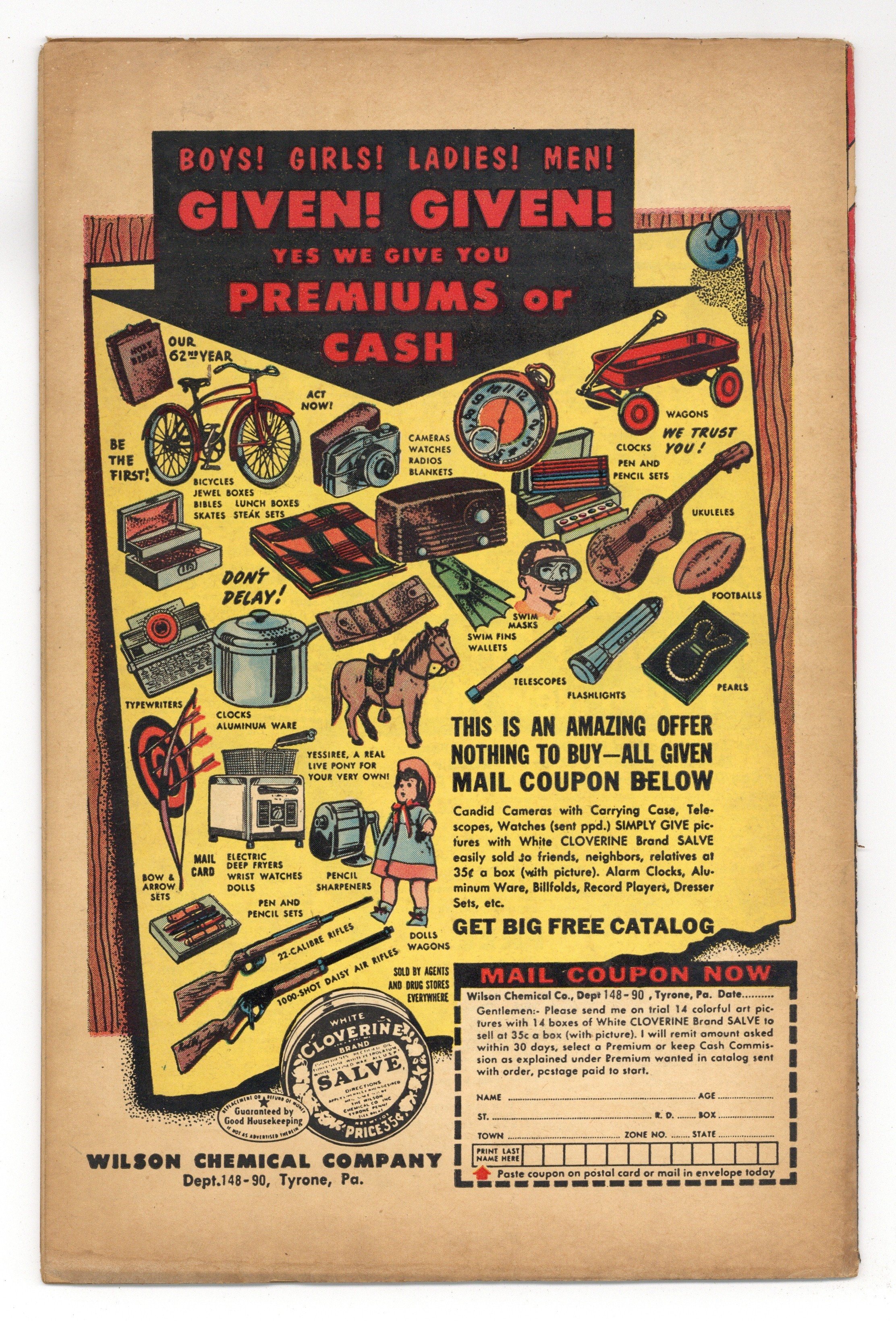 "The Man Who Went Back!," art by Pete Tumlinson; A man is pursued through time by tax collectors. "Hate Is the Master" text story. "The Hidden Man!," art by Ed Moline; A mysterious sniper who has shot seven people in the city park turns out to be a monkey in the nearby zoo who somehow acquired a gun. "He Wouldn't Stay Dead!," art by Bill Walton; A man conducts rites that reincarnate his shrewish wife's spirit into a figurine, but the new person, whom he names 'Jolie', is a kind and supportive ideal wife. "The Swami!," art by Mort Lawrence; A crook forces his stepson to commit crimes for him but one victim is a swami who turns the man's greed against him. "The Worst Thirst," art by Ed Winiarski; Two brothers are incensed that their neighbors have put down a well that has dried up the well on their property so they lay pipe to divert the water back down to the well on their property. 36 pgs., full color. $0.10. Cover price $0.10.