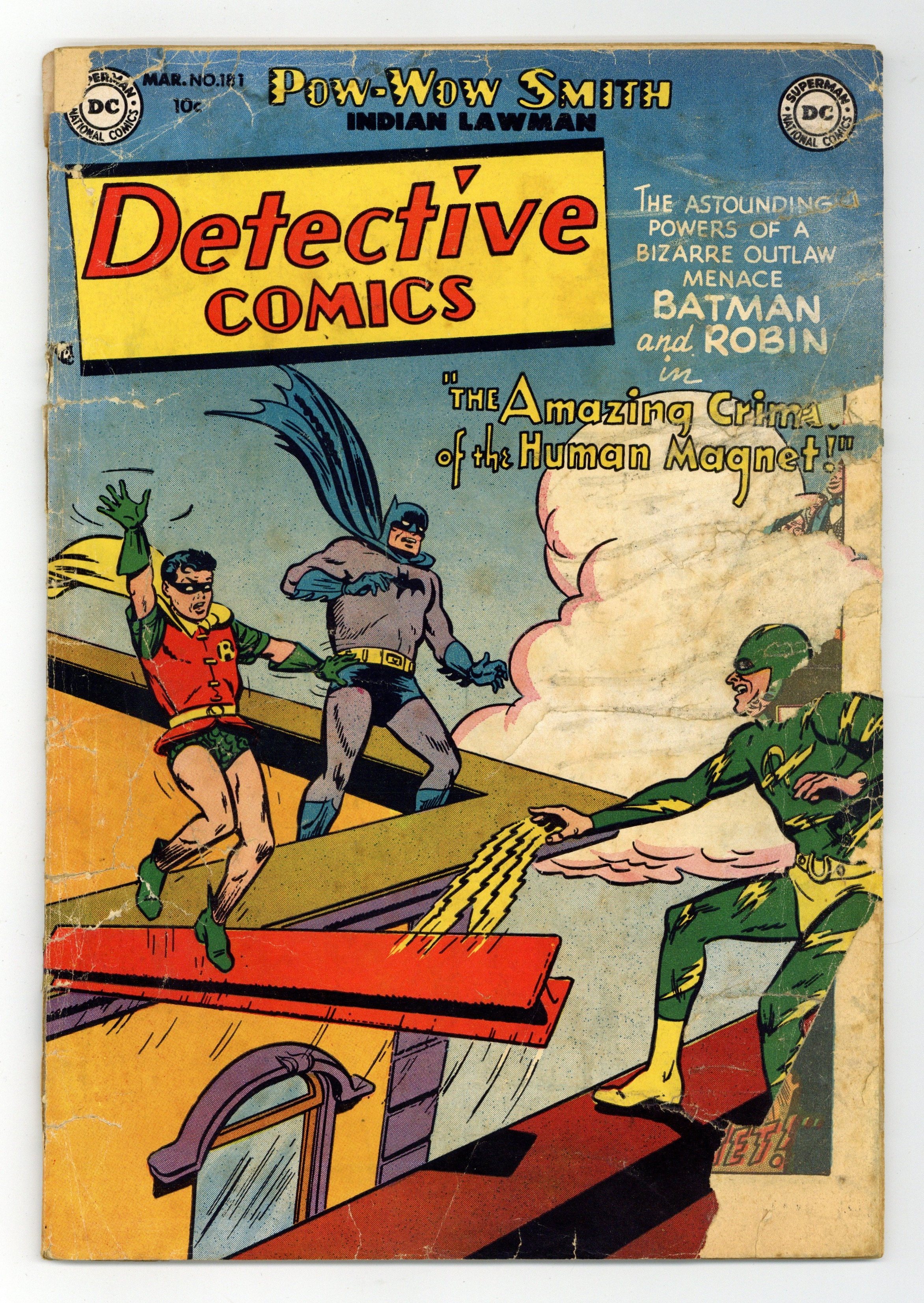 Cover by Win Mortimer. Stories by unknown. Art by Jim Mooney, Charles Paris, Leonard Starr, Ruben Moreira and unknown. The astounding powers of a bizarre outlaw menace Batman and Robin in "The Crimes of the Human Magnet!" with art by Jim Mooney and Charles Paris. Plus: Pow-Wow Smith, Indian Lawman in "Pow-Wow Smith, Medicine Man!" with art by Leonard Starr; Robotman in "The Safest Safe in the World!"; and Impossible -- But True! tale "Roy Raymond's Perfect Double" (featuring Roy Raymond) with art by Ruben Moreira. Also: Casey the Cop 1-pager by Henry Boltinoff; Jerry the Jitterbug 1-pager by Boltinoff; 2-page text piece "How Forgers Are Caught" by David Kahn; and Peg half-pager by Boltinoff. 44 pages, full color. Cover price $0.10.