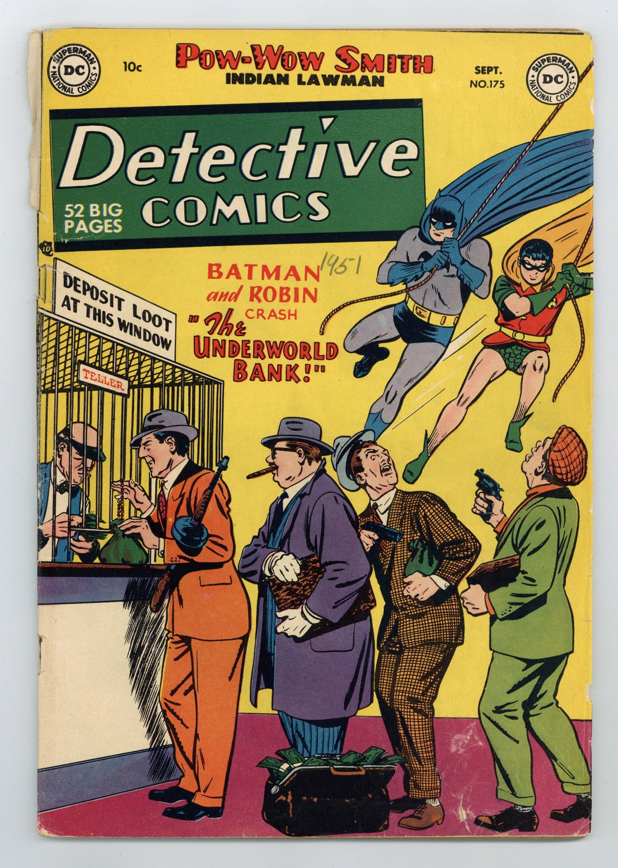 Cover by Win Mortimer. Stories by unknown. Art by Dick Sprang, Stan Kaye, Leonard Starr, Frank Bolle, Ruben Moreira, Carmine Infantino and John Belfi. Batman and Robin crash..."The Underworld Bank!" with art by Dick Sprang and Stan Kaye. Plus: Pow-Wow Smith, Indian Lawman in "The Wampum Wigwam" with art by Leonard Starr; Robotman in "The Boy Who Re-Made Robotman!" with art by Frank Bolle; Impossible -- But True! tale "The Ghost of Station WBT!" (featuring Roy Raymond) with art by Ruben Moreira; and 2-page story "The Taming of the Wild Bunch!" with art by Carmine Infantino and John Belfi. Also: Cartoon Criss-Cross activity page by Martin Naydel; 2-page text piece "Our Footsore Nation"; Peg 1-pager by Henry Boltinoff; and Quick Quiz activity page by H.T. Elmo. 52 pages, full color. Cover price $0.10.