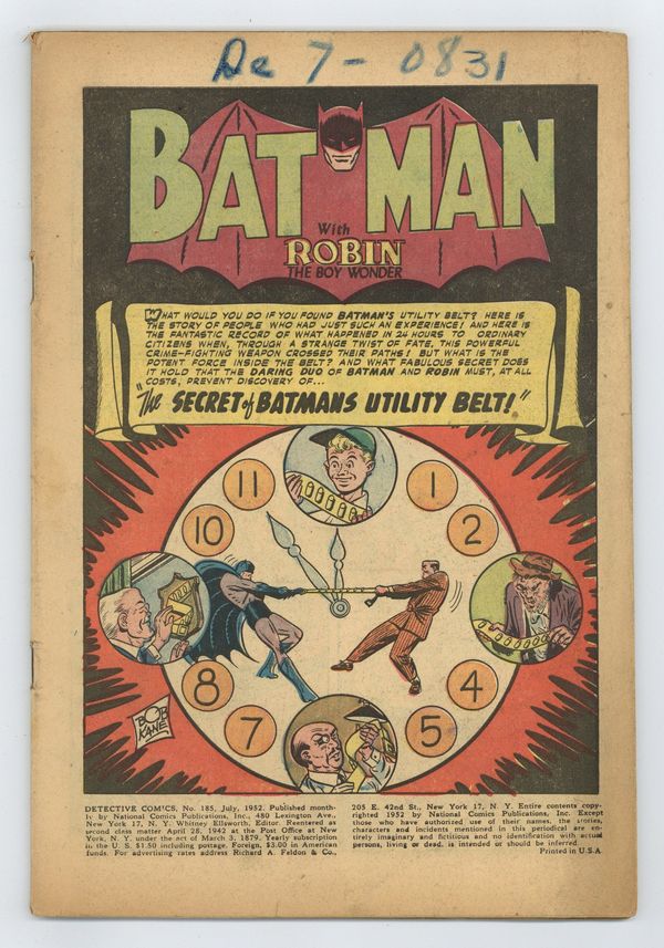 Cover by Win Mortimer. Stories by unknown. Art by Dick Sprang, Charles Paris, Leonard Starr, Ruben Moreira and unknown. Batman's lost his utility belt...and it means the end of his career if the underworld discovers what's in pocket X! Don't miss Batman and Robin in "The Secret of Batman's Utility Belt!" with art by Dick Sprang and Charles Paris. Plus: Pow-Wow Smith, Indian Lawman in "The Man Who Killed Pow-Wow Smith!" with art by Leonard Starr; Robotman in "The Three Impostors!"; and Impossible -- But True! tale "The Case of the Modern Aladdin!" (featuring Roy Raymond) with art by Ruben Moreira. Also: 2-page text piece "He Foresaw Wonders" by David Kahn. 44 pages, full color. Cover price $0.10.