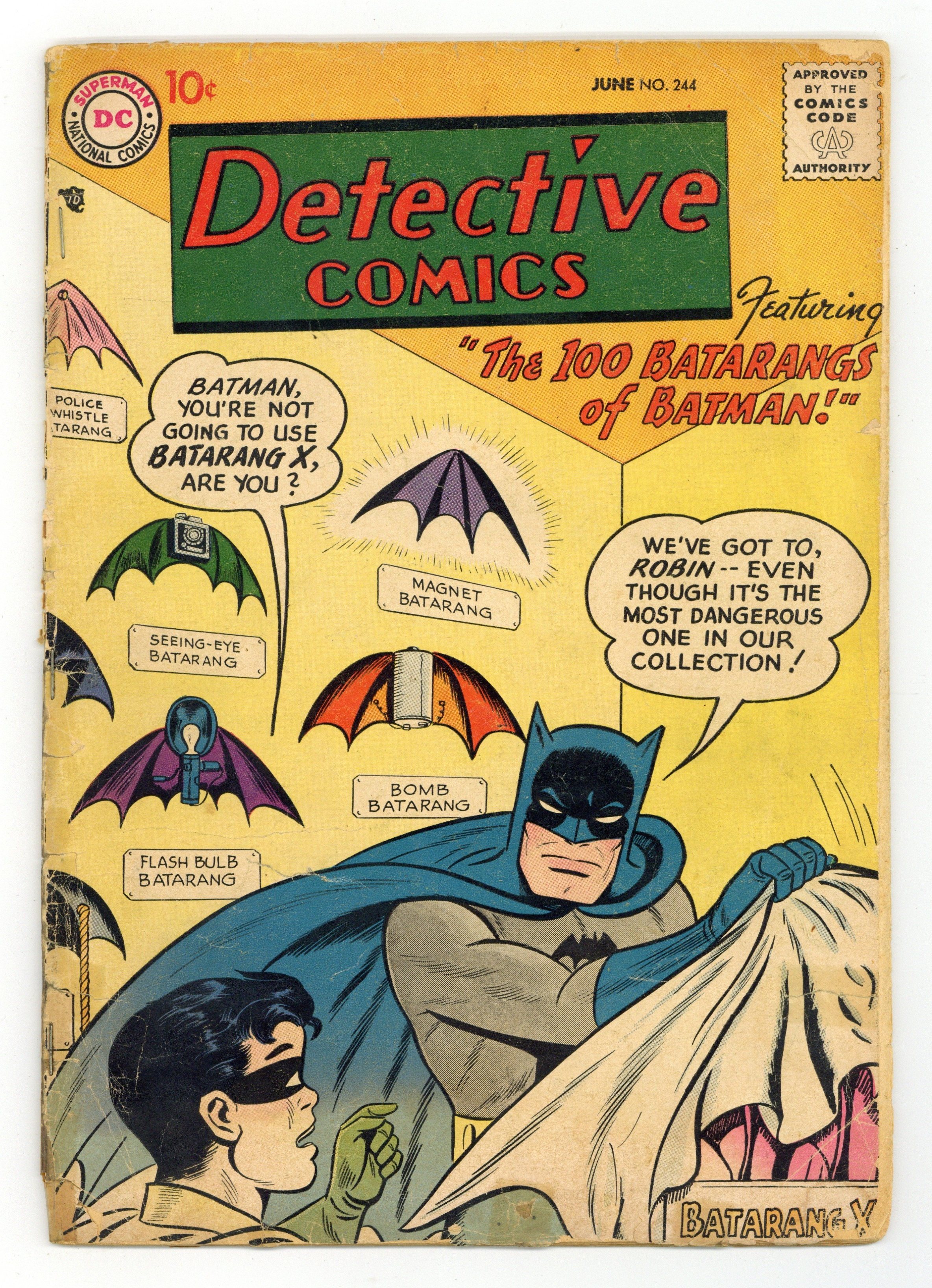 Cover art by Sheldon Moldoff. The 100 Batarangs of Batman starring Batman and Robin, script by Bill Finger, pencils by Sheldon Moldoff, inks by Charles Paris. Worldwide Adventures in Science! public service announcement, art by Ruben Moreira. Casey the Cop humor page by Henry Boltinoff. The Super-Spectacular starring Roy Raymond TV Detective, art by Ruben Moreira. Hit-And-Run Police Squads article. The Four Stunts of Doom starring John Jones Manhunter from Mars, art by Joe Certa. Warden Willis humor page by Henry Boltinoff. 36 pgs. $0.10. Cover price $0.10.