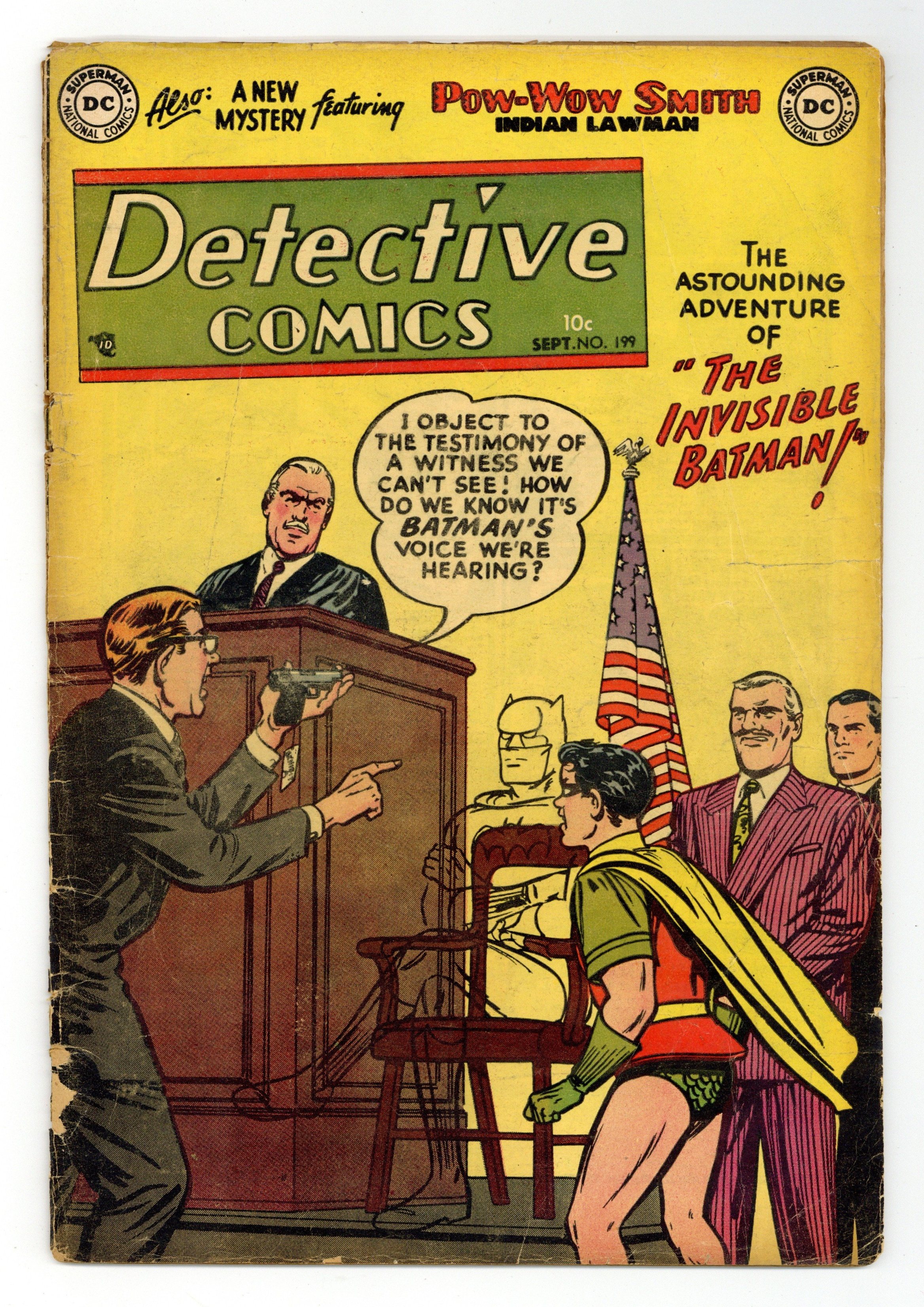 Cover by Win Mortimer. Stories by Bill Woolfolk and unknown. Art by Bob Kane, Lew Sayre Schwartz, Ray Burnley, Stan Kaye, Leonard Starr, Joe Certa and Ruben Moreira. While battling a crime spree in Gotham, Batman is accidentally doused with a radioactive dye, rendering himself invisible. Don't miss Batman and Robin in "The Invisible Batman!" by Bill Woolfolk, Bob Kane, Lew Sayre Schwartz, Ray Burnley and Stan Kaye. Plus: Pow-Wow Smith, Indian Lawman in "The Thunder Warrior of Hollow Mountain!" with art by Leonard Starr; Robotman in "The Robber Robot!" with art by Joe Certa; and Impossible -- But True! tale "The Girl Who Became a Witch!" (featuring Roy Raymond) with art by Ruben Moreira. Also: Varsity Vic half-pager by Henry Boltinoff; Quick Quiz activity half-pager by H.T. Elmo; Casey the Cop 1-pager by Boltinoff; and 2-page text piece "Cracking the Blackmail Bandits" by Jack Miller (as John Marston). 44 pages, full color. Cover price $0.10.