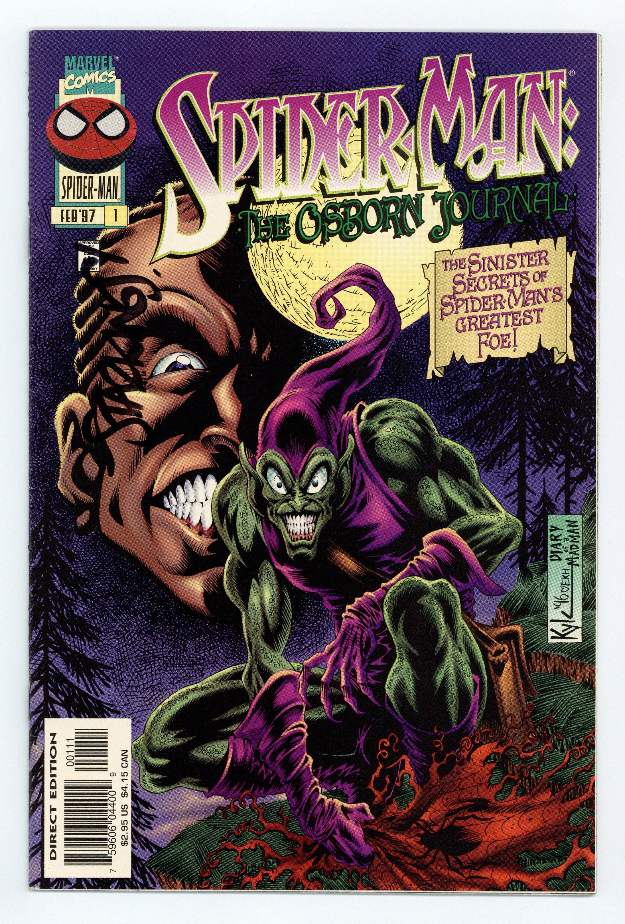 "Spider-Man: The Osborn Journals" Script by Glenn Greenberg. Pencils by Kyle Hotz. Inks by Jason Moore, Kyle Hotz, and Al Milgrom. Cover by Kyle Hotz. This special one-shot issue reveals Norman Osborn's whereabouts from his apparent death in the classic Amazing Spider-Man 122 to his shocking return in the Revelations storyline in Amazing Spider-Man 418 and Spider-Man (1990) 75. The original Green Goblin explains his undying hatred of Peter Parker and discloses his sinister machinations during the first and second Spider-Clone sagas! Flashback appearances by Harry Osborn, Liz Osborn, Normie Osborn, Mary Jane Watson, Gwen Stacy, Professor Miles Warren (aka the Jackal), Mendel Stromm (aka Gaunt), Seward Trainer, Ben Reilly (aka the Scarlet Spider), Judas Traveller, Scrier, Kaine, and the Hobgoblin. (Notes: This issue was reprinted in 2012 in the trade paperback: Amazing Spider-Man The Complete Ben Reilly Epic #6. There are not any advertisements inside.) 32 pages. Cover price $2.95.
