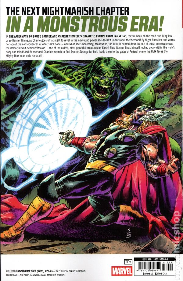 Volume 5 - 1st printing. "Gods Drink Blood!" Collects The Incredible Hulk (2023 Marvel) #20-25. Written by Phillip Kennedy Johnson. Art by Danny Earls, Danny Earls, Nic Klein, and Kev Walker. Cover by Nic Klein. Phillip Kennedy Johnson's horror-infused, monstrous run on the Hulk continues! In the aftermath of Bruce Banner and Charlie Tidwell's dramatic escape from Las Vegas, they're back on the road and lying low - or so Banner thinks. But as Charlie goes off at night to revel in the newfound power she doesn't understand, she's found by the Werewolf by Night, who warns her about the consequences of what she's done - and what she's becoming. Meanwhile, the Hulk is hunted down by one of those consequences: the immortal wolf-demon Varcolac, one of the oldest, most powerful creatures on Earth! As Charlie revels in her new strength, her childhood fantasy of becoming a super hero seems within reach after all - but as she continues to change in terrifying ways, she's not sure whether she's still one of the good guys. Plus: Banner becomes completely locked away within the body and mind of the Hulk! And Doctor Strange drops by for a spell! Softcover, 144 pages, full color. Rated T+ Cover price $19.99.