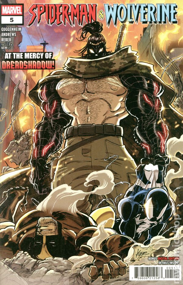 Written by Marc Guggenheim. Art by Kaare Andrews. Cover by Ario Anindito. DREADSHADOW! WOLVERINE and SPIDER-MAN have been put through the ringer - and are at the mercy of DREADSHADOW and the SHADOW COVEN! The mystery deepens as the threat increases…but what is this mysterious force's endgame? Featuring the first cover appearance of this all-new villain! 28 pgs, FC, T+. Cover price $3.99.