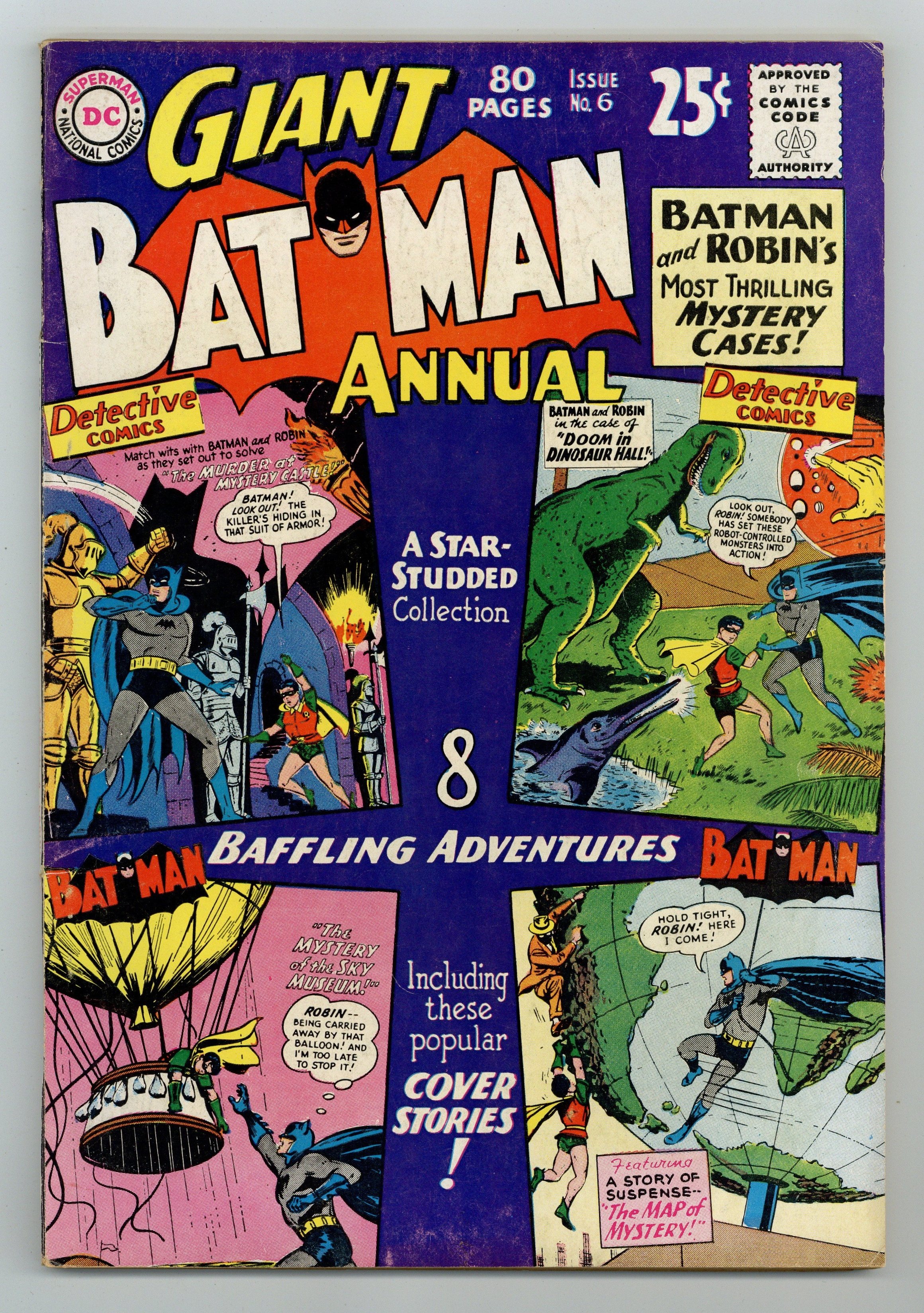 Winter 1963-64. All reprints. "Murder at Mystery Castle," script by Bill Finger, pencils by Sheldon Moldoff, inks by Charles Paris; When James Barham is murdered in his medieval castle there are four suspects, in order for Batman to solve this crime, he must use every ounce of his deductive ability. "The Gotham City Safari," script by Bill Finger, pencils by Sheldon Moldoff, inks by Charles Paris; Batman and Robin are made honorary members of the Safari Club by millionaire Alec Judson. "Mystery of the Sky Museum!", script by Edmond Hamilton, pencils by Sheldon Moldoff, inks by Charles Paris; Acting on a tip off, the Dynamic Duo visit the Sky Museum to investigate. "The Mystery of the Four Batmen!", script by Edmond Hamilton, pencils by Dick Sprang, inks by Charles Paris; A "Batman" is known to be smuggling stolen goods into the country. "The Creature from the Green Lagoon," script by David Wood, pencils by Sheldon Moldoff, inks by Charles Paris; Film producer Cory Blaine is shooting a movie on isolated Skull Island; The legendary monster the Locto appears. "The Map of Mystery!", script by Edmond Hamilton, pencils by Dick Sprang, inks by Charles Paris; Archaeologist Guy Hawtree sets off for Peru to study an ancient Incan monument, as he distrusts everyone, he leaves the location hidden on one of his maps. "The Danger Club," script by Edmond Hamilton, pencils by Lew Sayre Schwartz, inks by Charles Paris. "Doom in Dinosaur Hall!", script by Bill Finger, pencils by Sheldon Moldoff, inks by Charles Paris; Head of the Mechanical Museum of Natural History, Professor Hale, is found murdered. 84 pgs., full color. Cover price $0.25.