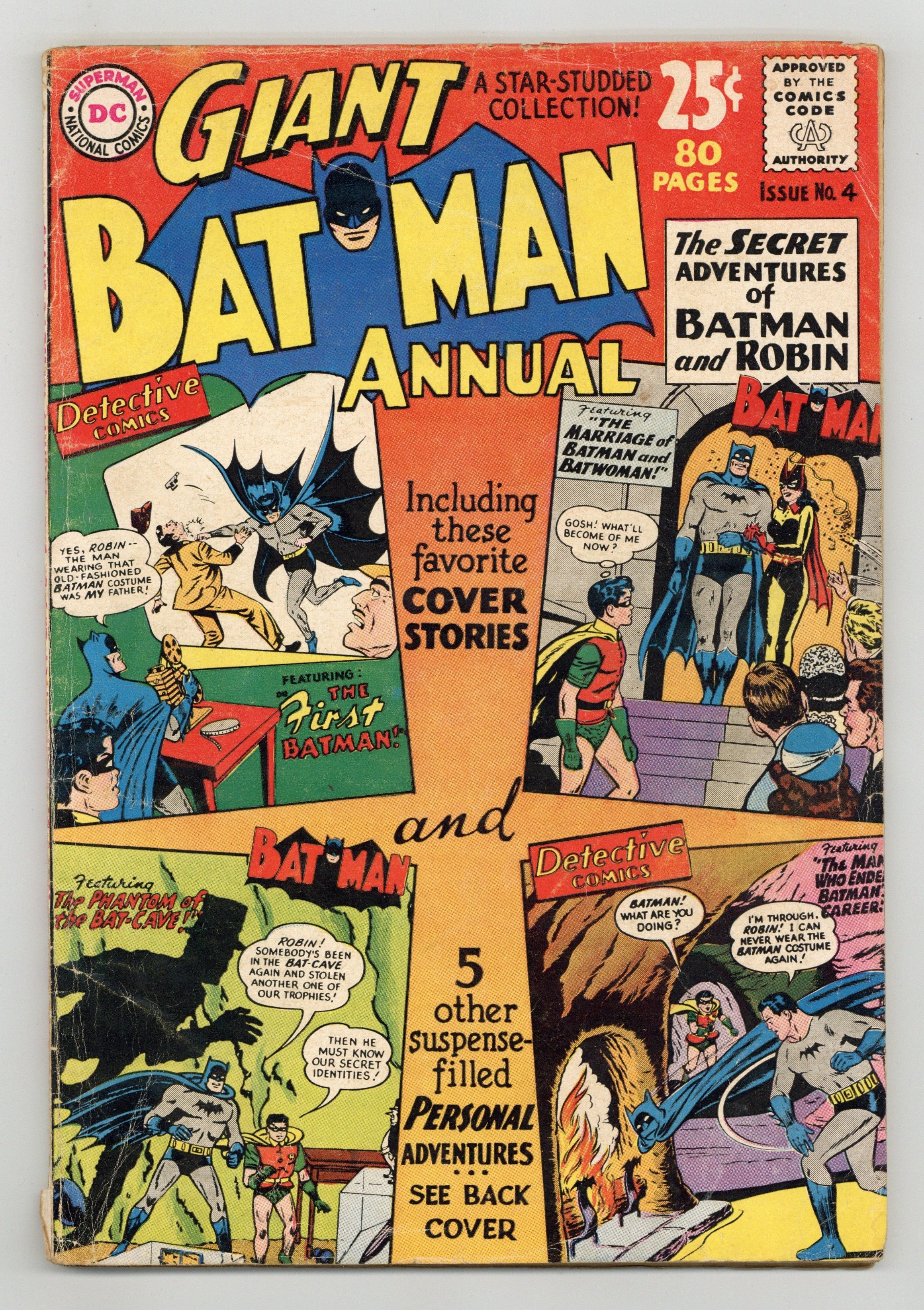 Winter 1962-1963. All reprints. Cover pencils by Curt Swan, Win Mortimer, and Sheldon Moldoff, inks by Stan Kaye and Sheldon Moldoff. "The First Batman," script by Bill Finger, art by Sheldon Moldoff (ghost for Bob Kane); The discovery of an old Batman-type costume in Bruce Wayne's attic re-opens the Wayne murder case, and helps him realize that Joey Chill had only been HIRED to kill his parents. "Am I Really Batman?", script by Bill Finger, pencils by Sheldon Moldoff (ghost for Bob Kane), inks by Charles Paris; Batman wakes from a sound sleep to find himself in a mental ward, not realizing that a Professor Milo had given him a dose of amnesia gas that dulls the will to live. "The Batwoman," script by Edmond Hamilton, pencils by Sheldon Moldoff (ghost for Bob Kane), inks by Charles Paris; Bruce Wayne is pleased that a newcomer, Kathy Kane, has taken such a liking to the Batman; However, when a mysterious new crimefighter appears on the scene, usurping much of Batman's glory, the Dynamic Duo steps in to halt her career before she gets seriously hurt. "The Vanished Batman," script by Edmond Hamilton, pencils by Sheldon Moldoff (ghost for Bob Kane), inks by Charles Paris; Gotham City is shocked to see Robin drive up to Police HQ one day in a Robinmobile, and refuses to comment on the disappearance of his long-time partner in crime-fighting. "The Phantom of the Batcave," script by Edmond Hamilton, pencils by Sheldon Moldoff (ghost for Bob Kane), inks by Charles Paris; Batman is puzzled when a trophy of a case he just completed disappears and is replaced by another item....right in the confines of the Bat-Cave. "Batman's College Days," script by Bill Finger, pencils by Sheldon Moldoff (ghost for Bob Kane), inks by Charles Paris; Bruce Wayne has been invited on a 3-day reunion cruise with some of his old college athletic team chums. The "Marriage of Batman and Batwoman," script by Bill Finger, pencils by Sheldon Moldoff (ghost for Bob Kane), inks by Ray Burnley. "The Man Who Ended Batman's Career," script by Bill Finger, pencils by Sheldon Moldoff (ghost for Bob Kane), inks by Charles Paris. 84 pgs., full color. Cover price $0.25.