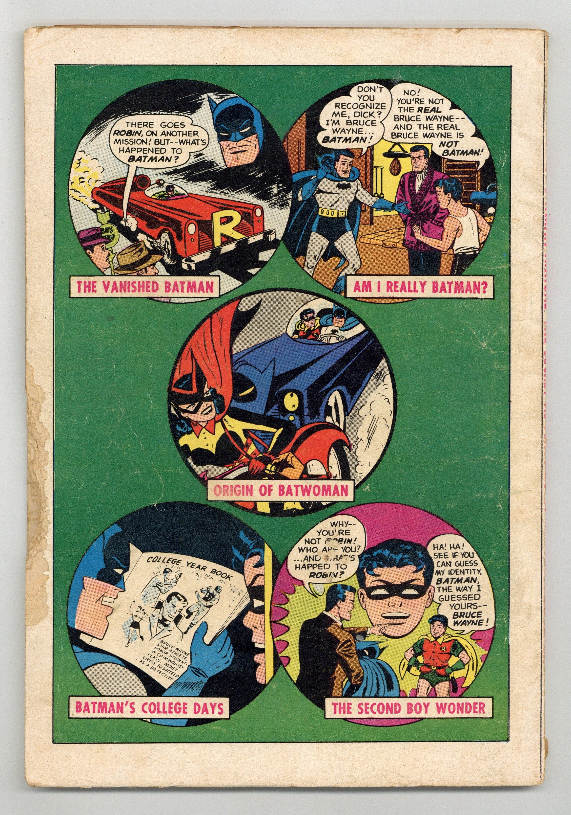 Summer 1964. All reprints, featuring four origin stories. Cover pencils by Sheldon Moldoff and Curt Swan, inks by Sheldon Moldoff and Stan Kaye. "Batman Meets Bat-Mite," script by Bill Finger, pencils by Sheldon Moldoff (ghost for Bob Kane), inks by Charles Paris; Bat-Mite, an elf-like being from another dimension appears in the Bat-Cave, he sets about "helping" Batman and Robin with his magical powers. "The Secret Life of Bat-Hound," script by Bill Finger, pencils by Sheldon Moldoff (ghost for Bob Kane), inks by Charles Paris; When Batman and Robin are trapped by Mr. Midas in a collapsed mine, Bat-Hound alerts Batwoman and the foursome tackle the Midas Mob. "Bat-Girl," script by Bill Finger, pencils by Sheldon Moldoff (ghost for Bob Kane), inks by Charles Paris; Betty Kane deduces that her Aunt Kathy is secretly Batwoman and assumes the identity of Bat-Girl. "The Dynamic Trio," script by Edmond Hamilton, pencils by Sheldon Moldoff (ghost for Bob Kane), inks by Charles Paris; The Dynamic Duo become the Dynamic Trio when they team up with Mysteryman, but Vicki Vale is determined to uncover the newcomer's real identity. "The Secret of Batman's Butler," script by Bill Finger, pencils by Sheldon Moldoff (ghost for Bob Kane), inks by Charles Paris; A mistake by Alfred when he first became the Wayne butler causes him to consider resigning his position years later. "The New Team of Superman and Robin," script by Bill Finger, pencils by Curt Swan, inks by Sheldon Moldoff. "Batwoman's Publicity Agent," script by Bill Finger, pencils by Sheldon Moldoff (ghost for Bob Kane), inks by Sheldon Moldoff; Bat-Mite returns and teams up with Batwoman but he has not legislated for falling in love with her. "The Second Batman and Robin," script by Bill Finger, pencils by Sheldon Moldoff (ghost for Bob Kane), inks by Charles Paris. 84 pgs., full color. Cover price $0.25.