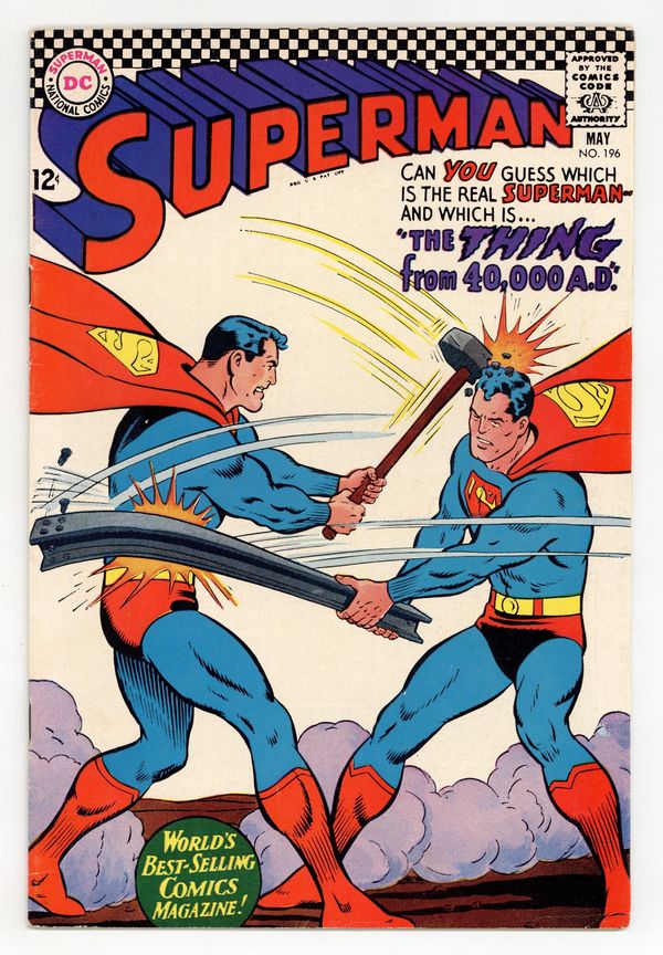 Tags: Superman$21.50Cover pencils by Curt Swan, inks by George Klein. The Thing From 40,000 A.D.!, script by Bill Finger, art by Wayne Boring; Superman battles a lookalike. The Star of Steel! starring Superman, Lyrica Lloyd, Marcus Moller, Perry White, Lois Lane, Jimmy Olsen, and Claude Keith, script by Otto Binder, art by Al Plastino. Letter to the editor from Irene Vartenoff. 36 Pages, Full Color. Cover price $0.12.