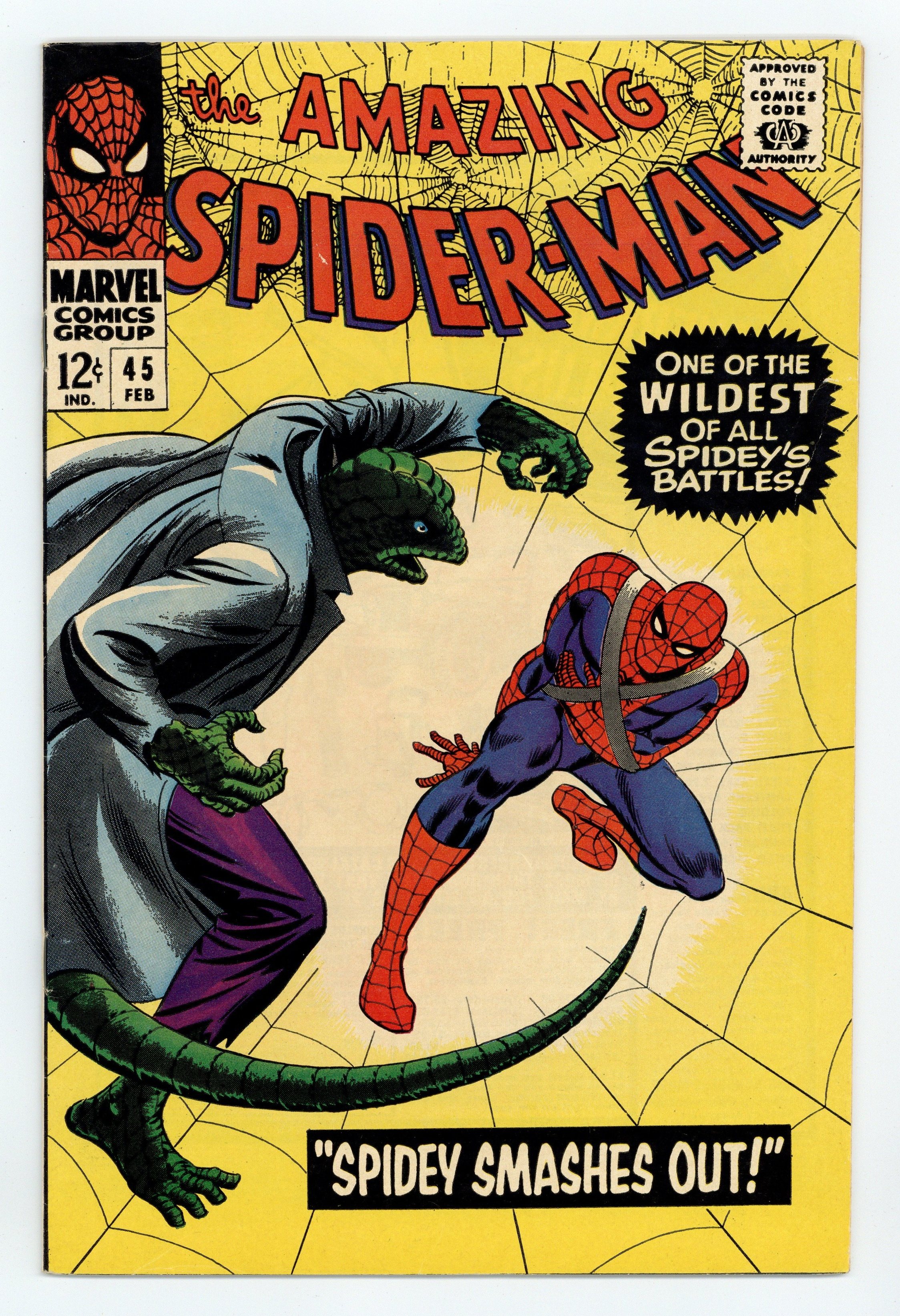 Cover by John Romita Sr.. The third appearance of the Lizard in Spidey Smashes Out!, script by Stan Lee, art by John Romita Sr.; The Lizard heads to Dr. Connor's lab to find a formula to transform reptiles into his personal army; Aunt May worries about Peter; The Lizard and Spider-Man battle aboard a train. Reprinted in Marvel Tales # 185. 36 pgs., full color. $0.12. Cover price $0.12.