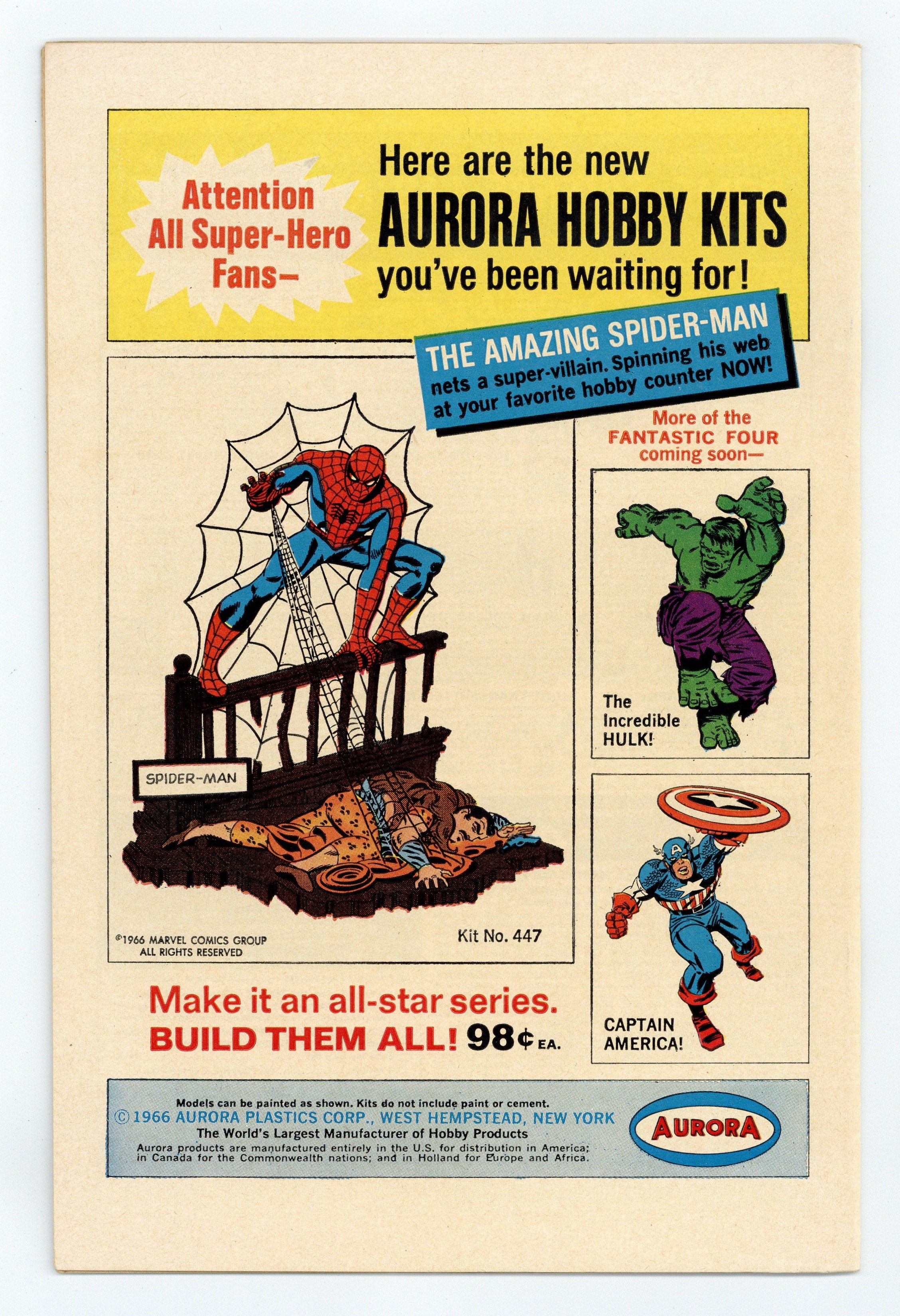 Cover art by Steve Ditko. Second appearance of the Green Goblin in The Return of the Green Goblin!, script by Stan Lee, art by Steve Ditko; Spider-Man attends a fan club meeting organized by Flash Thompson, but the Green Goblin crashes the meeting; Fortunately the Human Torch is in attendance to help Spider-Man; During the battle Spider-Man finds out that Aunt May is in the hospital and he leaves, causing everyone to believe that he is a coward. Reprinted in Marvel Tales # 12 and 155. Letter to the editor by comics writer Doug Moench. 36 pgs. $0.12. Cover price $0.12.