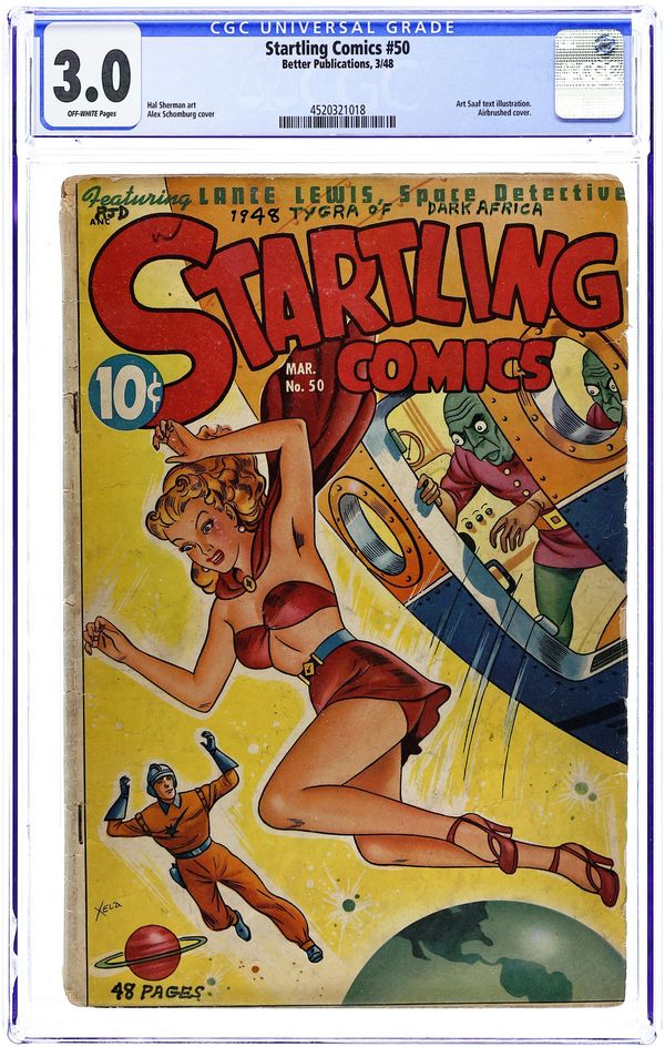 Cover art by Alex Schomburg. Phalanx of Fear starring Tygra. The Scourge of the Dark Seas! starring Sea Eagle. The White Elephant text story starring Tygra by Charles Strong. The Amoeba Men! starring Lance Lewis, Space Detective. The Joneses story. The Longest Arm text story by Edward Hassett. Jefferson Jones story, art by Hal Sherman. 52 pgs. $0.10. Cover price $0.10.