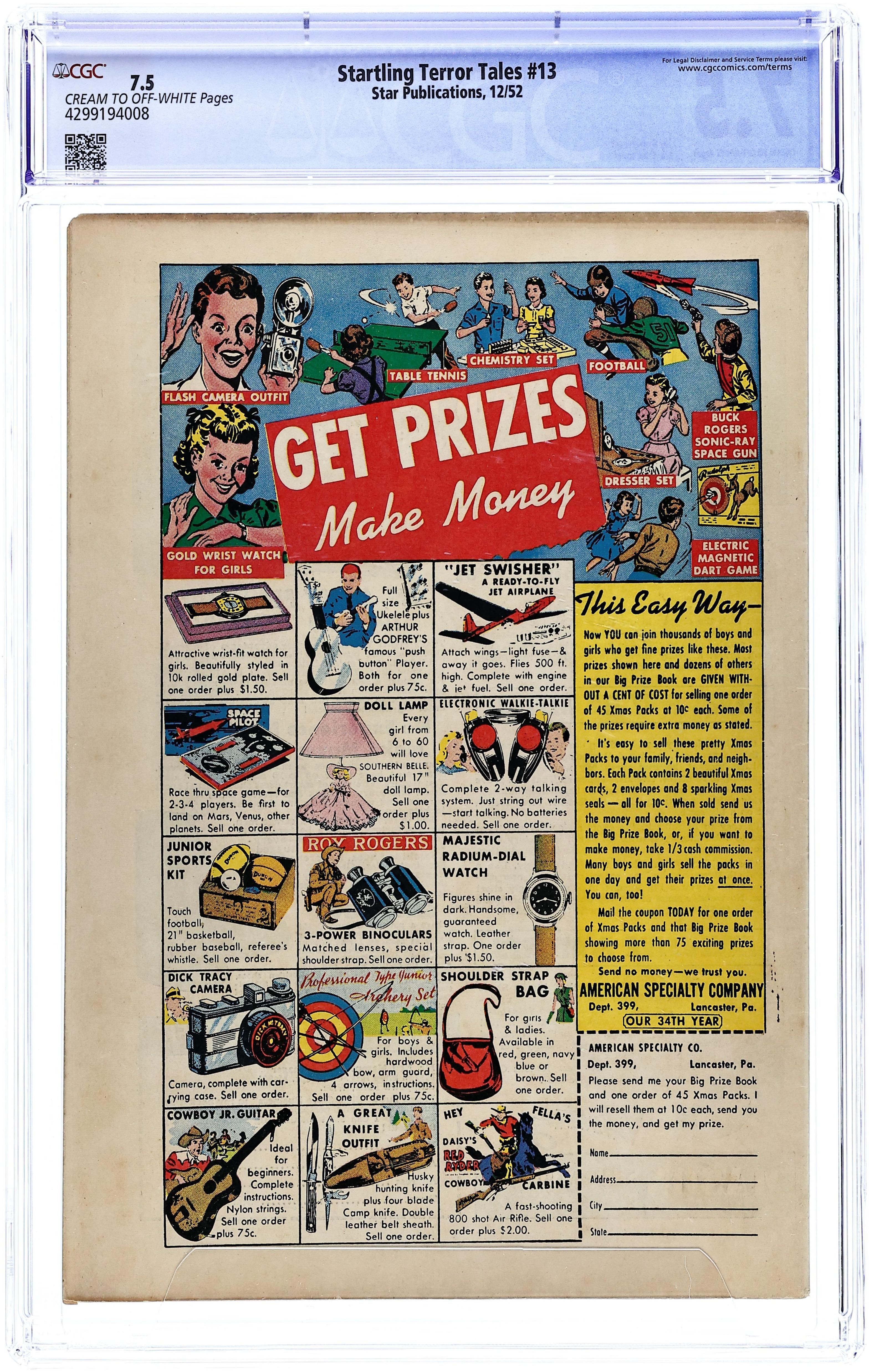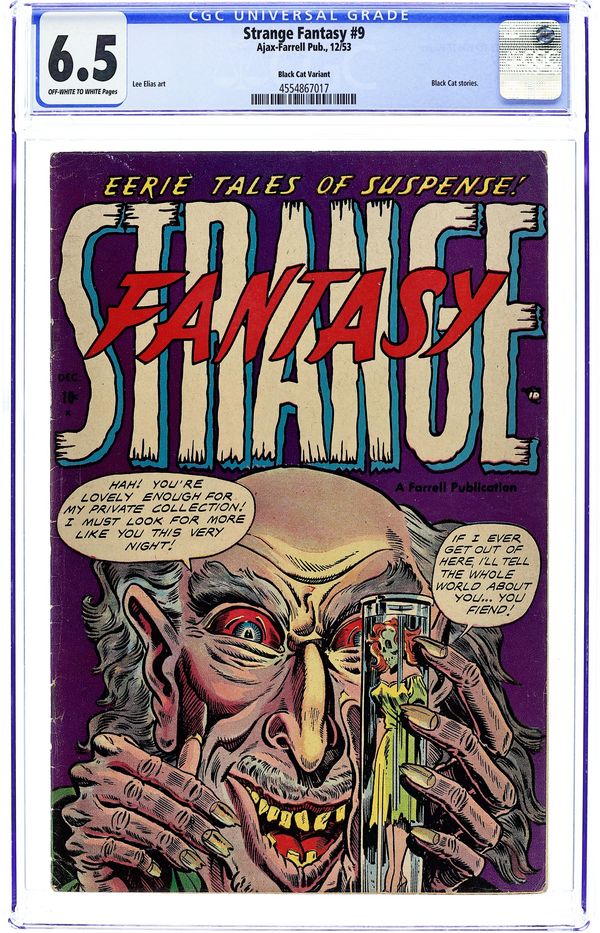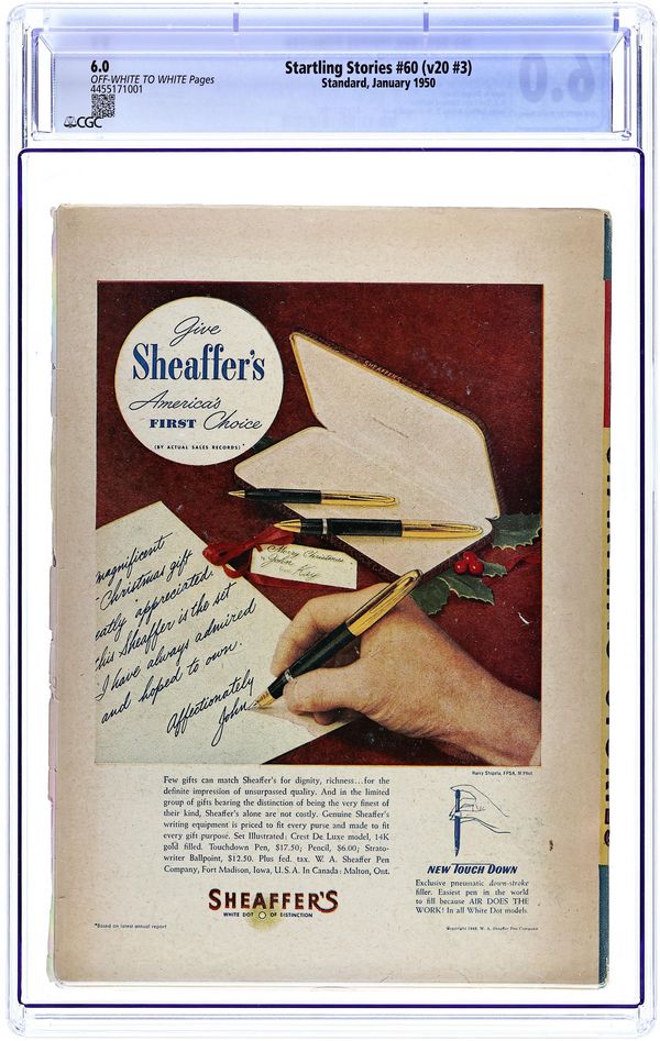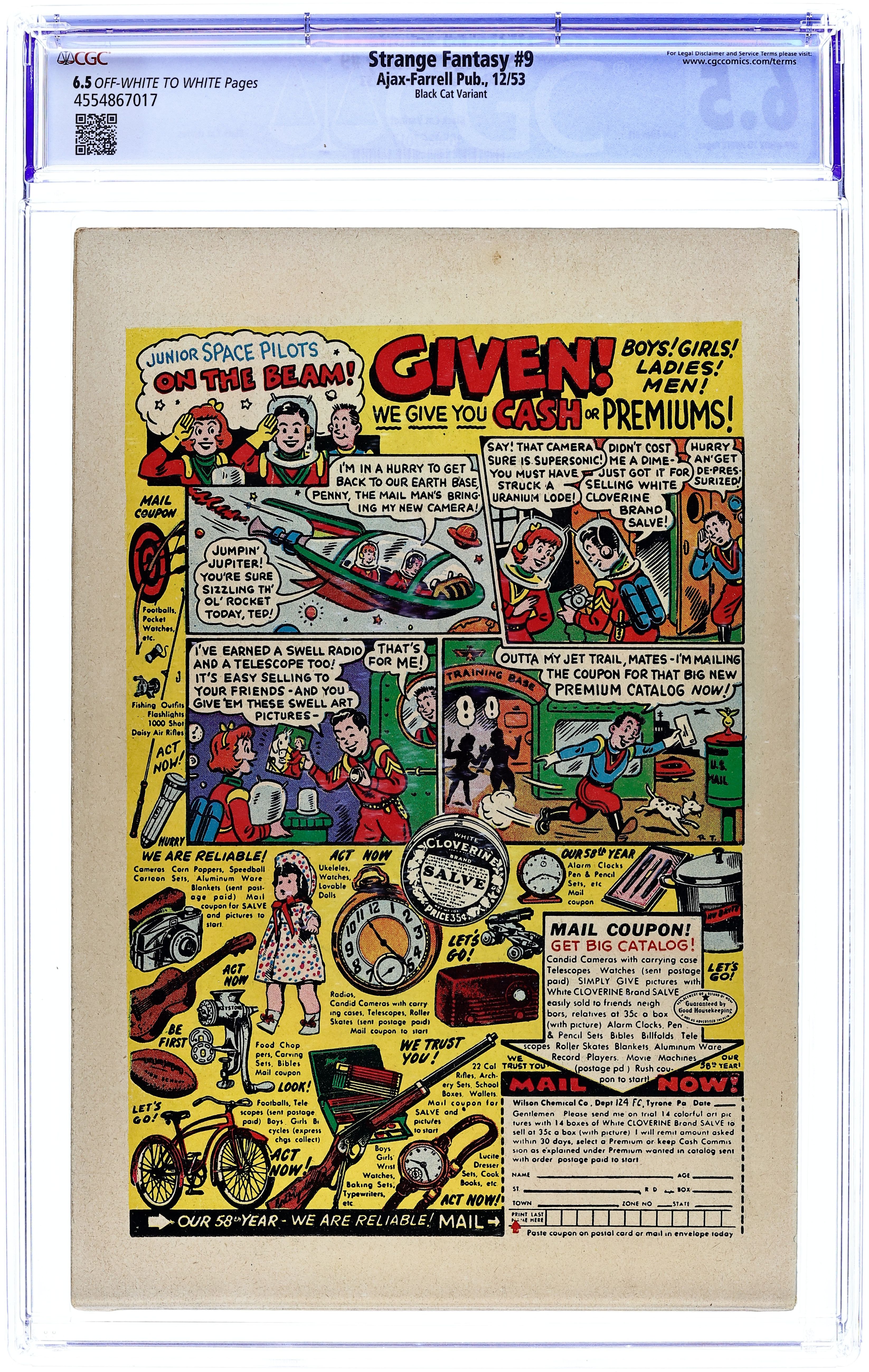 Cover art by Joe Maneely. "The Ghost Came C.O.D.", art by Reed Crandall; A schemer comes up with the idea to send off invoices to the recently deceased figuring grieving widows will just pay the invoice to take care of the matter quickly; The fraud works until one of the dead comes back to his shop and reveals himself as a Martian living within the body of a human. "The Replacement!", art by Alphonso Greene; A criminal steals a dying man's jacket and when he finds an airline ticket in the pocket he attempts to use the plane to escape the police. "The Voice of Fido!", art by Werner Roth; A ventriloquist uses a dog in his act in place of a dummy; When a fire breaks out the dog leads people out by speaking and the ventriloquist gets credit for it, but the ventriloquist denies speaking. "It Waits Under the Sea!", art by Al Eadeh; A man plans to traverse the globe completely underwater, but when he sees a tunnel he becomes curious and directs the submarine into it. "The Eerie Experiment!", art by Robert Q. Sale; Two men in 1977 using a radio attempt to warn a government agent breaking up a communist spy ring in the past. "Time Machine" text story. "He Wore a Black Beard," art by Ed Winiarski; A man living with an inventor is surprised by a visitor who claims to be from the future; The man resents the inventor and comes up with a scheme to frame him with the time traveler's help. 36 pgs., full color. Cover price $0.10.