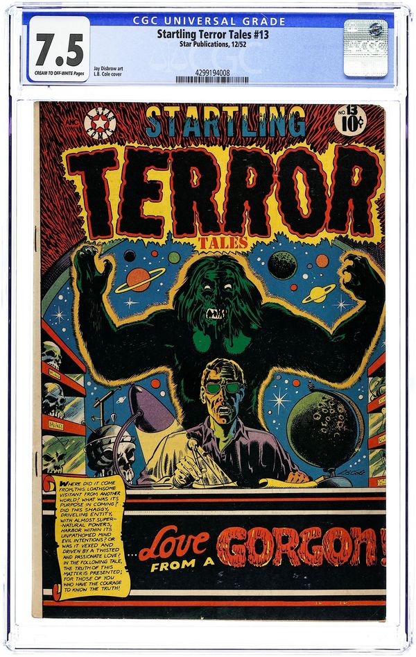 Cover by L. B. Cole. Stories and art by Jay Disbrow and others. Pre-Code horror and crime comics from L. B. Cole's Star Publications. A scientist accidentally contacts a hideous alien from beyond the stars, and she's got a crush on him. Jungle hero Jo-Jo, Congo King and his mate discover The Garden of Lost Maidens. Killer Leonard Scarnici strikes terror in the lawful and lawless alike with his viciousness, but a redheaded beauty proves to be his downfall. Another classic horror cover by L. B. Cole. Love from a Gorgon; Burning Sands of Death; Jo-Jo: The Medicine Men Murders; Jo-Jo: Terror of the Lost Maidens; The "Lone Wolf" of Fear. 36 pages, Full Color. Cover price $0.10.
