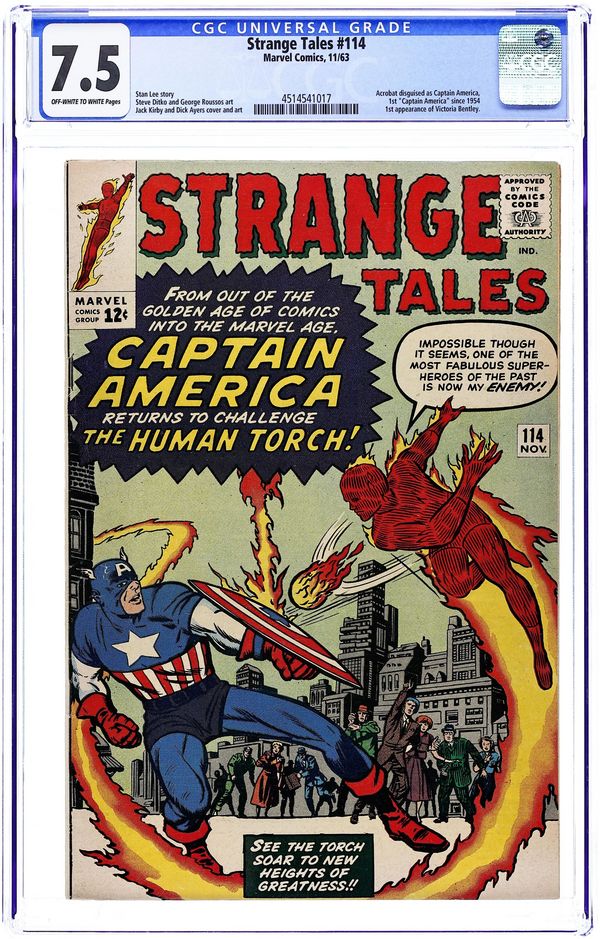 Cover pencils by Jack Kirby, inks by Dick Ayers. "The Human Torch Meets... Captain America", script by Stan Lee (co-plot, dialogue) and Jack Kirby (co-plot, uncredited), pencils by Jack Kirby, inks by Dick Ayers; The Human Torch is upstaged by the return of Captain America, but the Torch realizes that it is his old enemy the Acrobat in disguise and defeats him; This is the first appearance of Captain America since the Golden Age (though it's actually the Acrobat from issue 106 disguised as the hero). "The Bridge" text story. Third appearance of Dr. Strange in "The Return of the Omnipotent Baron Mordo!", script by Stan Lee and Steve Ditko (co-plot), pencils by Steve Ditko, inks by George Roussos; Strange is lured into a trap in England by Baron Mordo, but defeats him with the help of a woman with latent magical talents; First appearance of Victoria Bentley. 36 pgs., full color. Cover price $0.12.