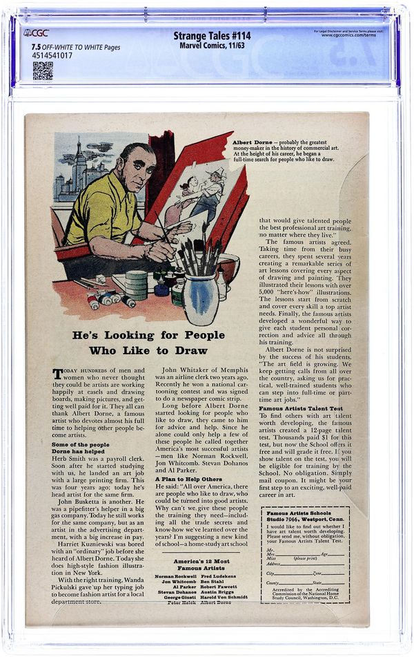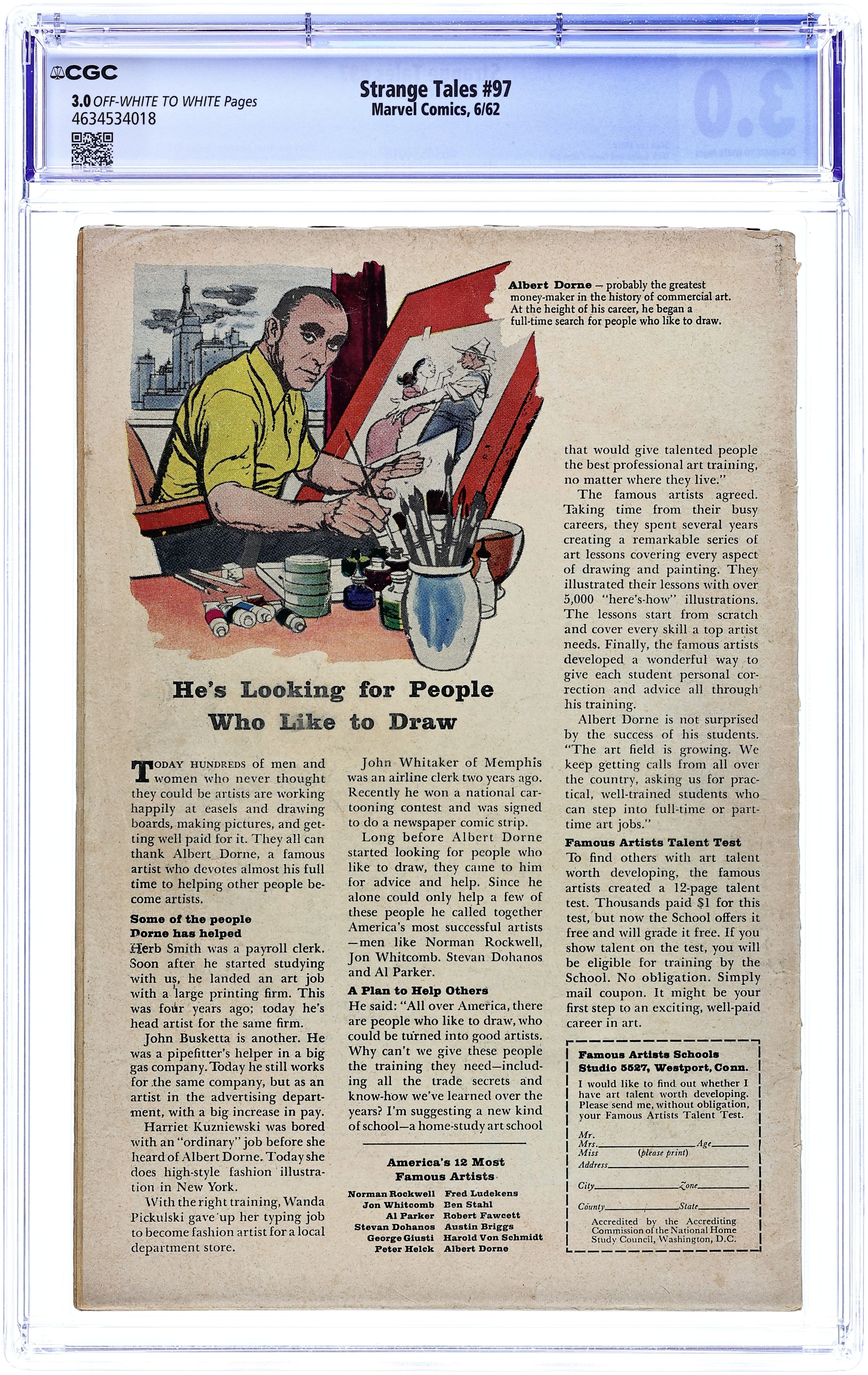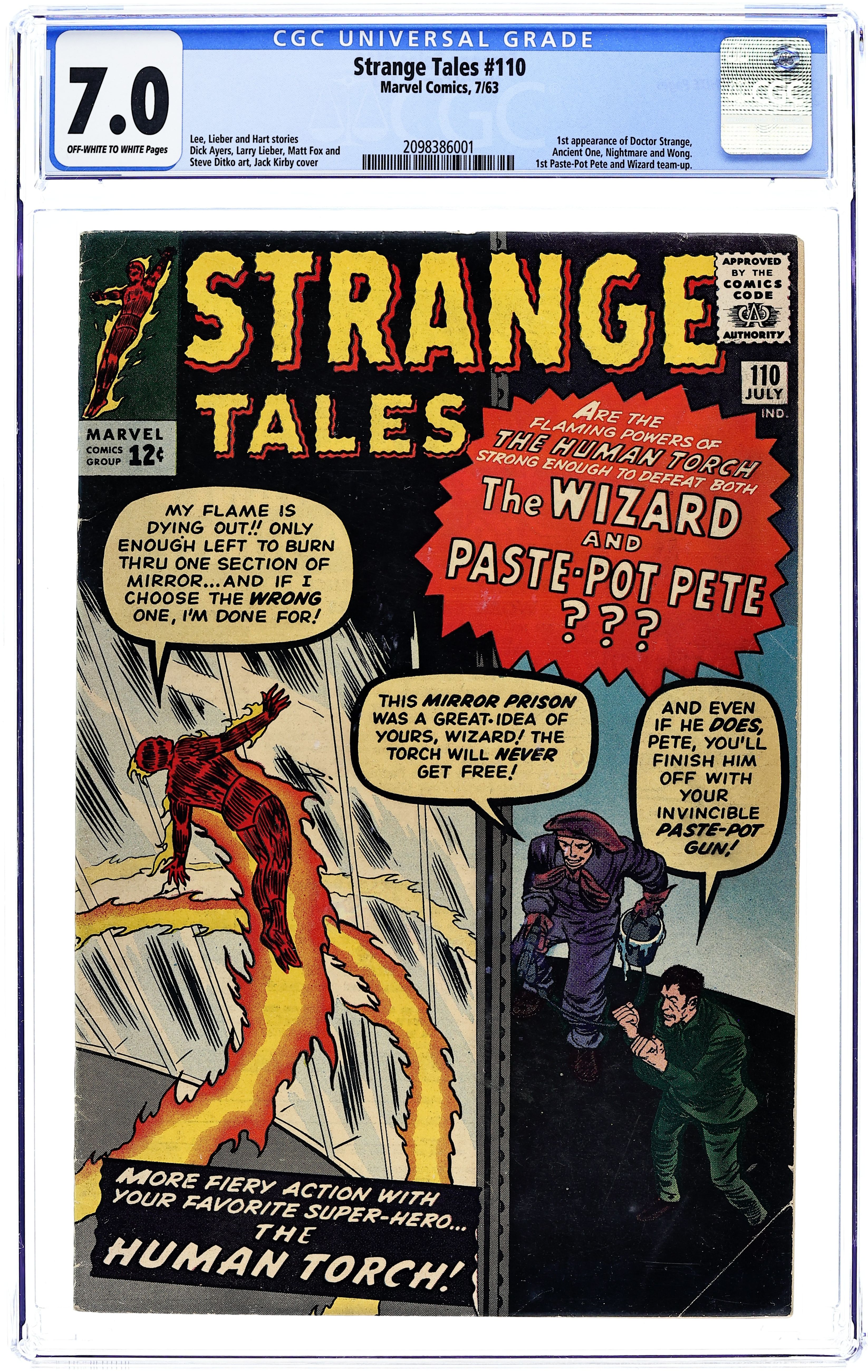 Cover pencils by Jack Kirby, inks by Dick Ayers. Doctor Strange makes his landmark first appearance in this issue in "Dr. Strange Master of Black Magic!", a 5-page back-up story, script by Steve Ditko (plot) and Stan Lee (script), art by Steve Ditko; Doctor Strange is called on by a man having bad dreams, and confronts Nightmare; The mans dreams reveal that he is guilty of fraud and Strange makes him confess; First appearances of Nightmare, the Ancient One, and Wong. The Human Torch is cover featured in "The Human Torch vs. the Wizard and Paste-Pot Pete!", script by Stan Lee (plot) and Ernie Hart [as H.E. Huntley] (script), art by Dick Ayers; Johnny practices on his obstacle course, then thinks back on his adventures with The Wizard and Paste-Pot Pete; By a wild coincidence, Pete breaks The Wizard out of jail and the two join forces. "Silent Stranger" text story. "We Search the Stars!", script by Stan Lee (plot) and Larry Lieber (script), pencils by Larry Lieber, inks by Matt Fox; A space expedition discovers what they believe is a savage human-like species and flee, not suspecting that they are an advanced psychic race able to meet all their needs through thought. 36 pgs., full color. Cover price $0.12.