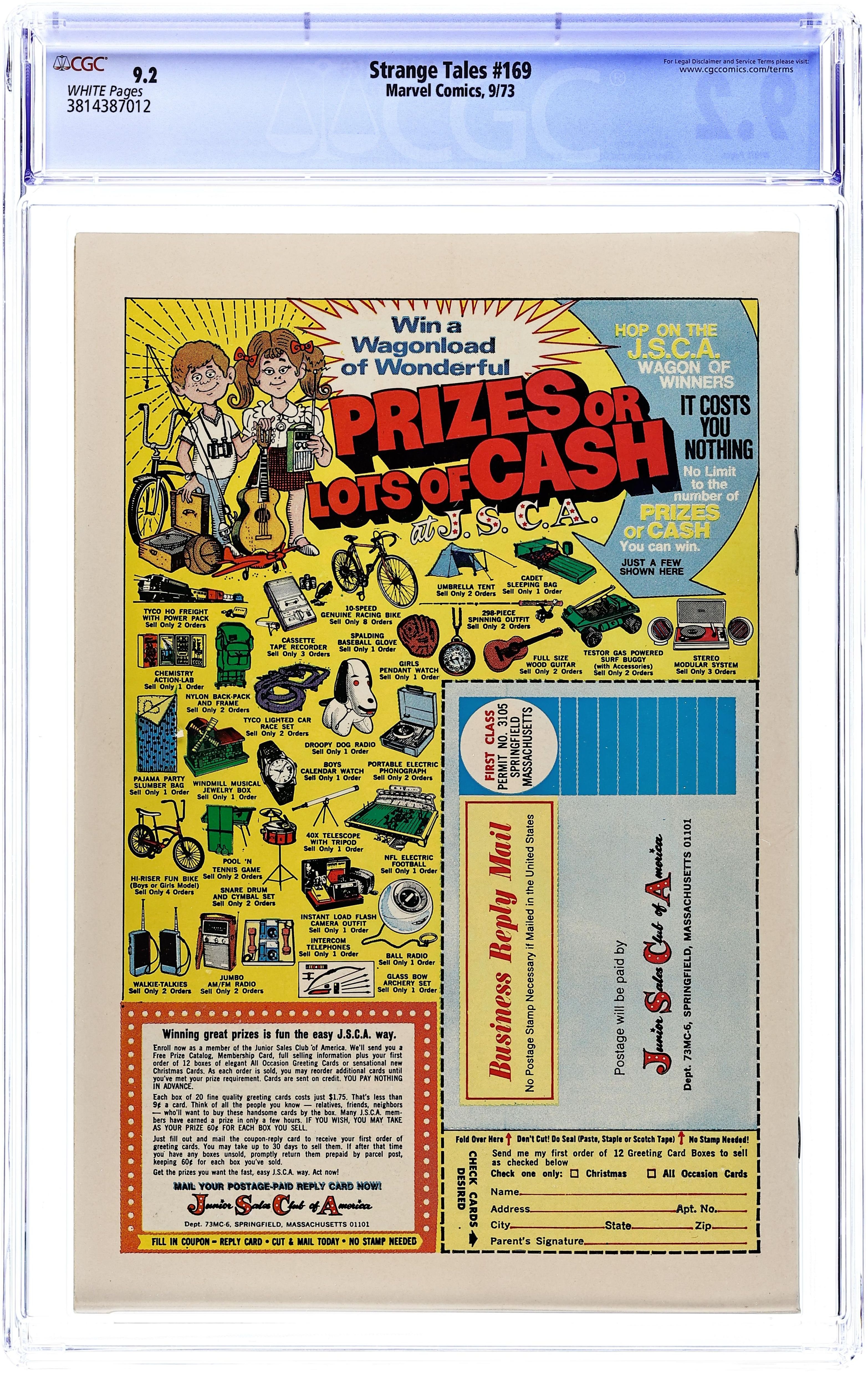 Cover pencils by Marie Severin. Nick Fury stars in "Final Encounter!", script and art by Jim Steranko; The battle between Fury & Strucker rages until Fury manages to remove his Satan glove; Minutes later, as HYDRA thugs enter the room, they discover 2 Strucker's! One of them is revealed to be wearing a mask, panics, and is incinerated in an Alpha-Particle Reactor Cube; The other orders Laura put aboard the Dyna-Soar and takes off from Hydra Island, despite the imminent detonation of The Death Spore bomb. "The Sands of Death," script by Roy Thomas and Marie Severin (co-plot), pencils by Marie Severin, inks by Herb Trimpe; The Living Tribunal decrees that because Doctor Strange has unleashed a menace to the cosmos Earth must be destroyed; Before he recites the Incantation of Oblivion he recounts events leading up to his decision, agreed upon by his 3 faces of Equity, Revenge & Necessity; Doctor Strange challenges the Tribunal to let him deal with the menace, having defeated the forces of darkness in the past. Strange is granted a reprieve for as long as it takes the Sands of Death to run out of a mystic Hourglass resting in the middle of Stonehenge; Cameos by Dormammu and Umar. Letter to the editor from comics writer Bill Mantlo. Merry Marvel Marching Society info and coupon. 36 pgs., full color. Cover price $0.12.