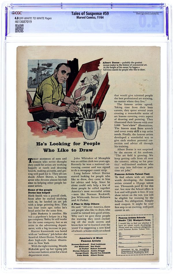 Cover pencils by Jack Kirby, inks by Don Heck. Second appearance of Iron Man in "Iron Man versus Gargantus!", script by Stan Lee (plot) and Robert Bernstein (as R. Berns) (script), pencils by Jack Kirby, inks by Don Heck; Introduction and origin of Gargantus. "Wrong Number" text story. "Work of Art!", script by Stan Lee (plot) and Larry Lieber (script), pencils by Larry Lieber, inks by Sol Brodsky; An unsuccessful artist tries to force a new painter to show him how to paint lifelike pictures; The painter is a sorcerer, and traps the artist in one of his paintings, the secret to his realism. "Prophet of Doom!", script by Stan Lee, art by Steve Ditko; A man from the future arrives in the present day in order to set himself up as ruler; He attempts to extort 100 million dollars from the Secretary General of the United Nations only to be shocked when the Secretary reveals that he too is from the future and that there are agents planted in every era in order to apprehend criminals who may attempt to alter the course of events. 36 pages, full color. Cover price $0.12.